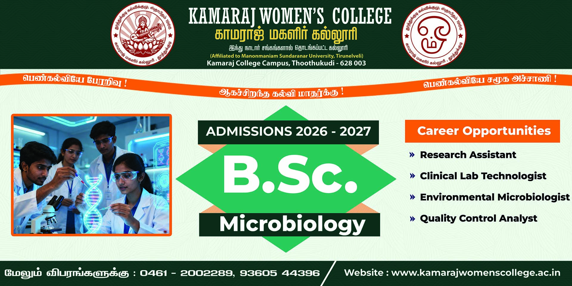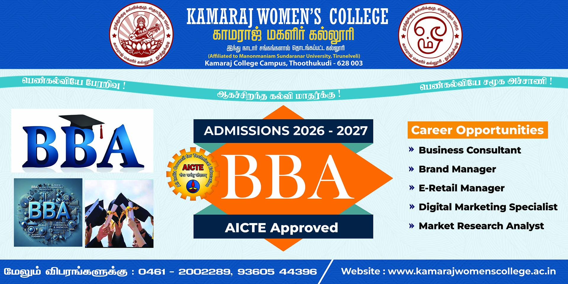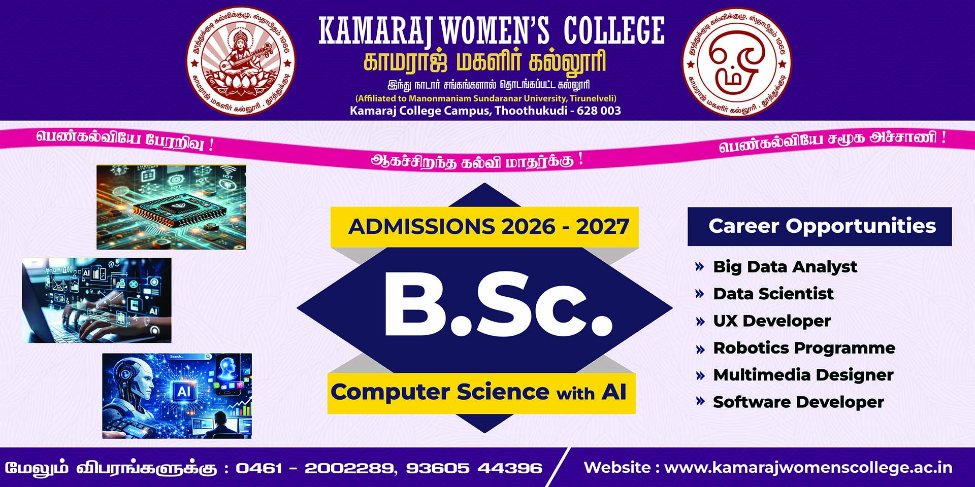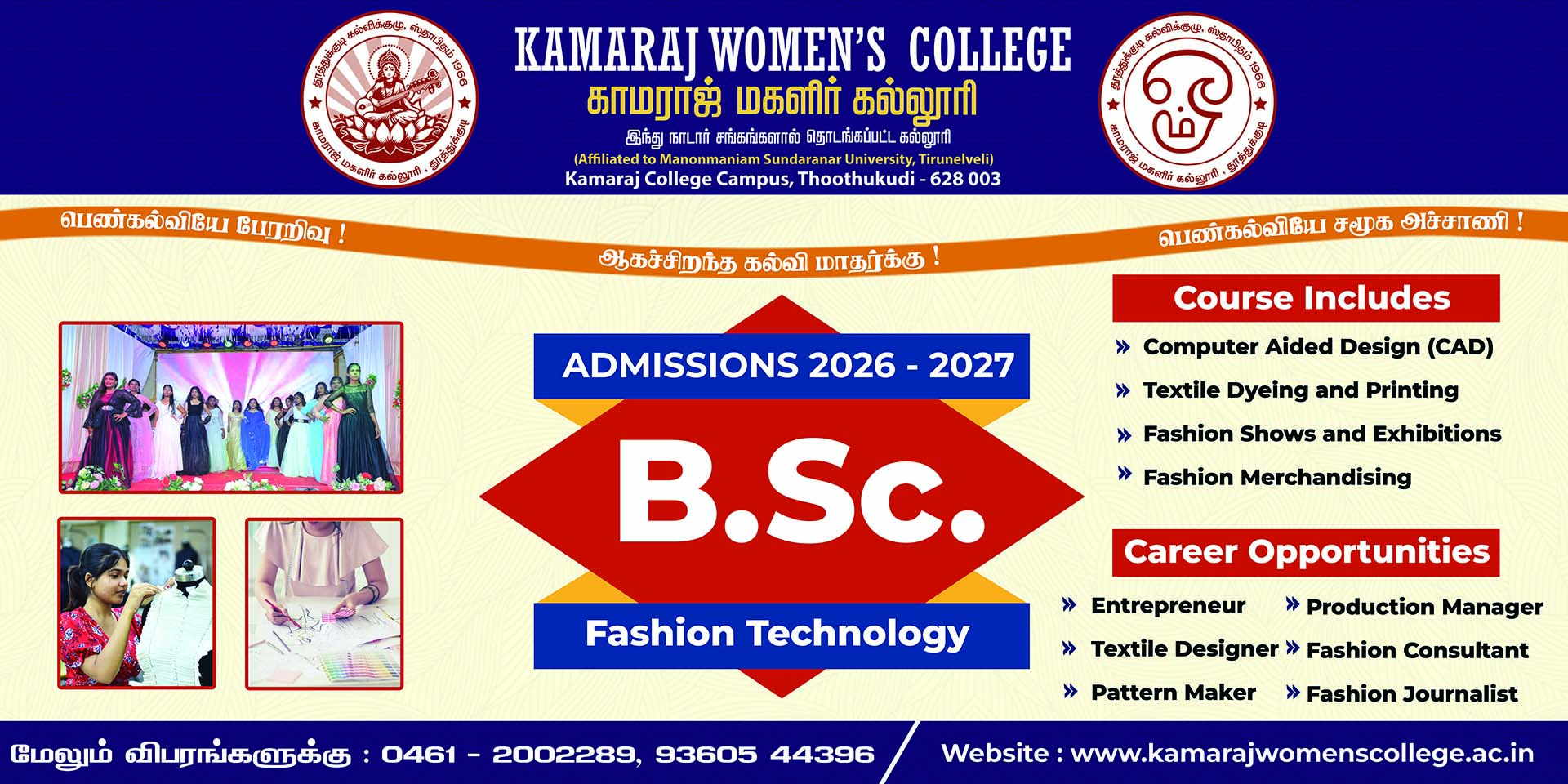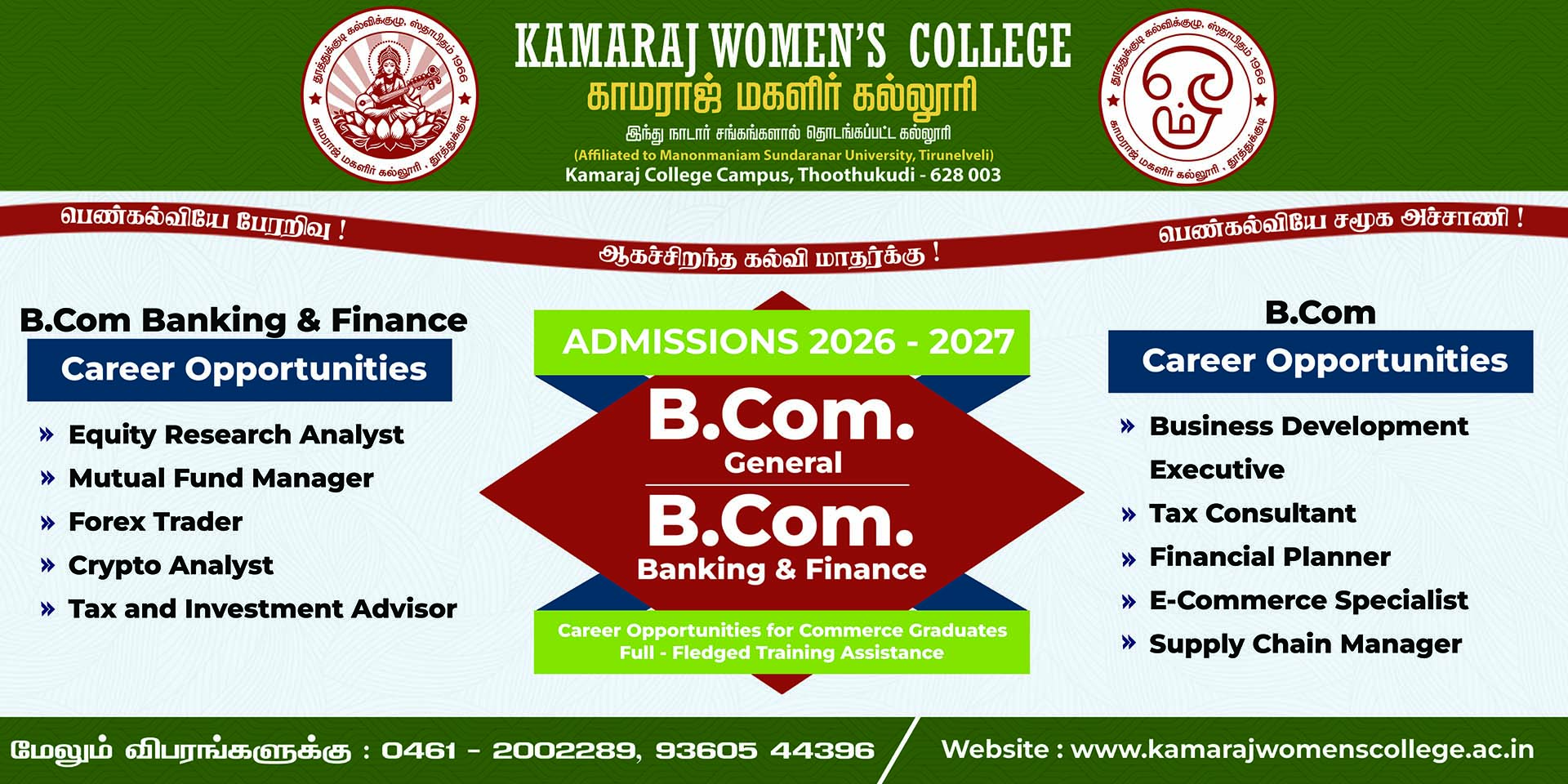Kamaraj Women’s College is committed to nurturing and creating young women to be outstanding citizens of the world. Students of Kamaraj Women’s College understand that with the power of knowledge, comes the responsibility to use it for the utmost benefit of the community. They recognize challenges as opportunities. Kamaraj Women’s College has long been recognized as a premier institution of higher learning for students in southern districts of Tamil Nadu. A centre for academic excellence…. Read More >>>