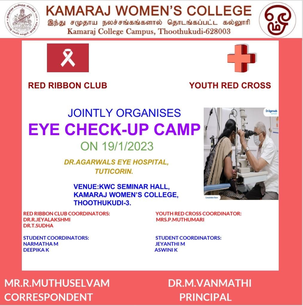 நமது நான்காம் அறிவான கண் பரிசோதனை எமது காமராஜ் மகளிர் கல்லூரியில் 19.01.2023 அன்று YRC மற்றும் RRC சார்பாக, டாக்டர் அகர்வால் கண் மருத்துவமனை மூலம் கண் பரிசோதனை முகாம் நடைபெற்றது. இதில் பொதுமக்களும் எமது மாணவியர்களும் ஆசிரியர்களும் கலந்து கொண்டு தங்களது கண்களை பரிசோதித்தார்கள். மேலும் எமது மாணவியர் கண் பராமரிப்பு முறை பற்றியும், கண் தானம் பற்றியும் அறிந்து கொண்டார்கள்.