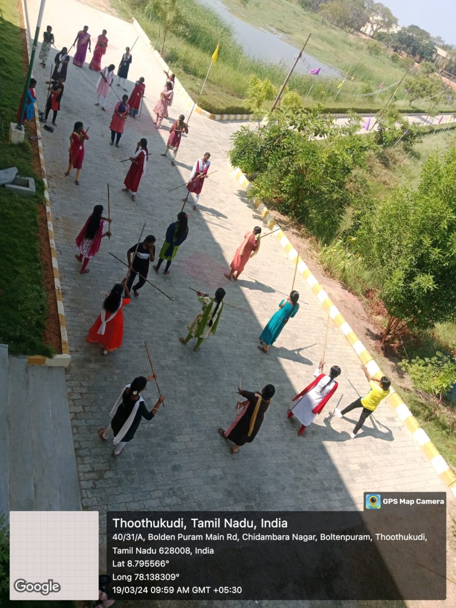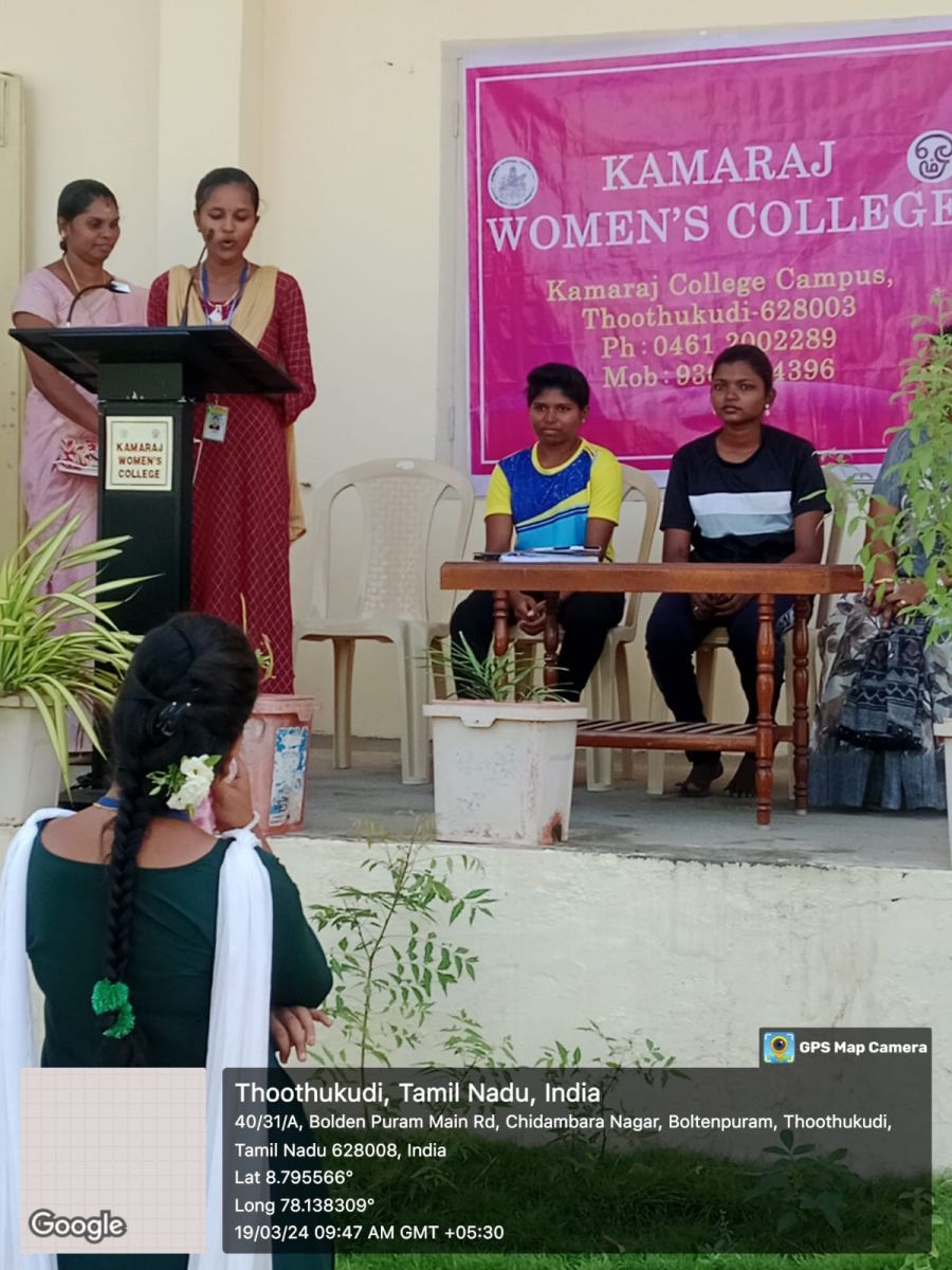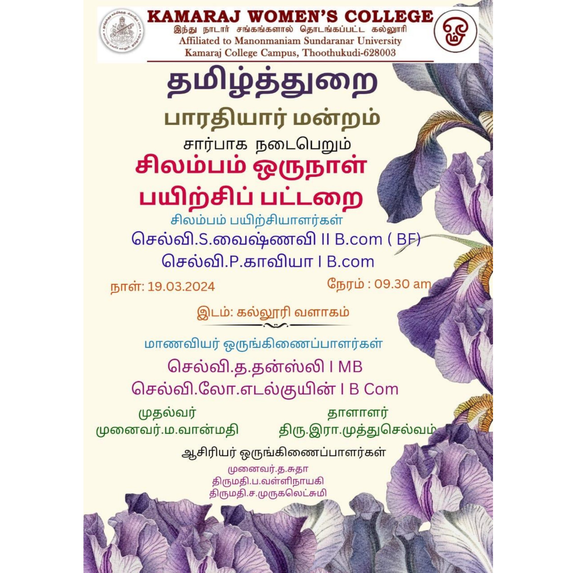 நமது காமராஜ் மகளிர் கல்லூரியில் இன்று (19. 3. 2024 ) தமிழ்த்துறை பாரதியார் மன்றம் சார்பாக மாணவிகளுக்கு ஒரு நாள் பயிற்சி பட்டறையாக சிலம்பம் நடத்தப்பட்டது. இந்நிகழ்ச்சியானது தமிழ்த்தாய் வாழ்த்துடன் இனிதே துவங்கியது. இதில் மாணவிகளுக்கு தன்னம்பிக்கையை வளர்க்கும் விதமாக தற்காப்புக் கலைகளுள் ஒன்றான சிலம்பம் மாணவியர்களுக்கு மாணவியர்களால் கற்றுக் கொடுக்கப்பட்டது. வணிகவியல் துறையைச்சேர்ந்த மாணவிகளான வைஷ்ணவி, காவியா இருவரும் மாணவிகளுக்கு சிலம்பம் கற்றுக் கொடுத்தனர். தமிழர்களின் வீர விளையாட்டான சிலம்பம் பற்றிய செய்திகளையும், இந்த கம்பு சுற்றுதல் மூலம் உடலுக்கும் மனதிற்கும் ஏற்படும் புத்துணர்ச்சி பற்றியும் மாணவி வைஷ்ணவி மாணவிகளுக்கு எடுத்துரைத்தார். இந்நிகழ்ச்சியில் நமது கல்லூரி மாணவிகள் கலந்து கொண்டு பயனடைந்தனர். பின்னர் நாட்டுப்பண்ணுடன் நிகழ்ச்சி இனிதே நிறைவுற்றது. இதில் மாணவி தன்ஸ்லி தொகுப்புரை வழங்கினார்.