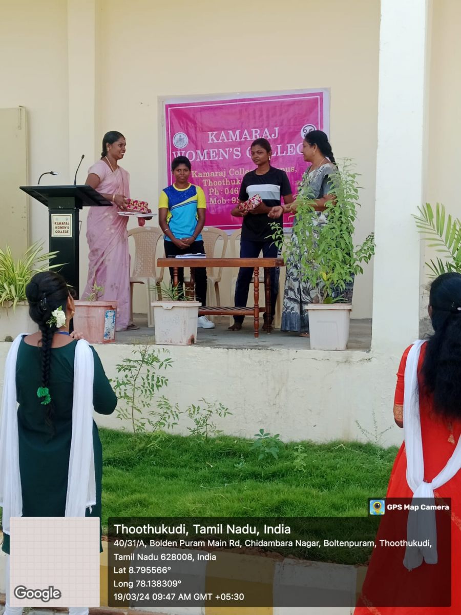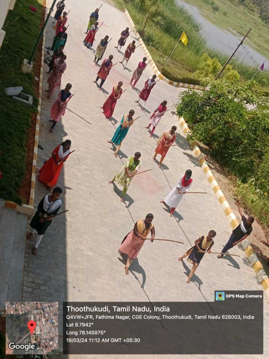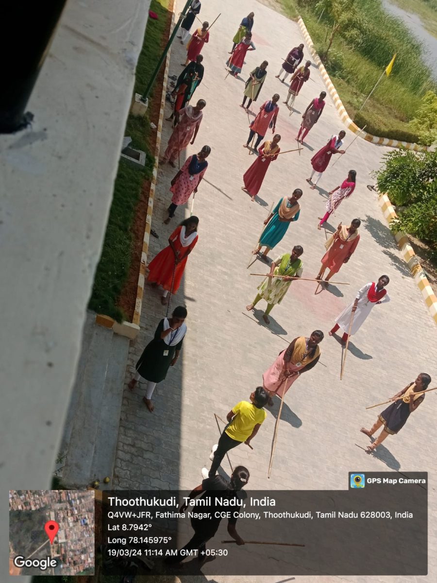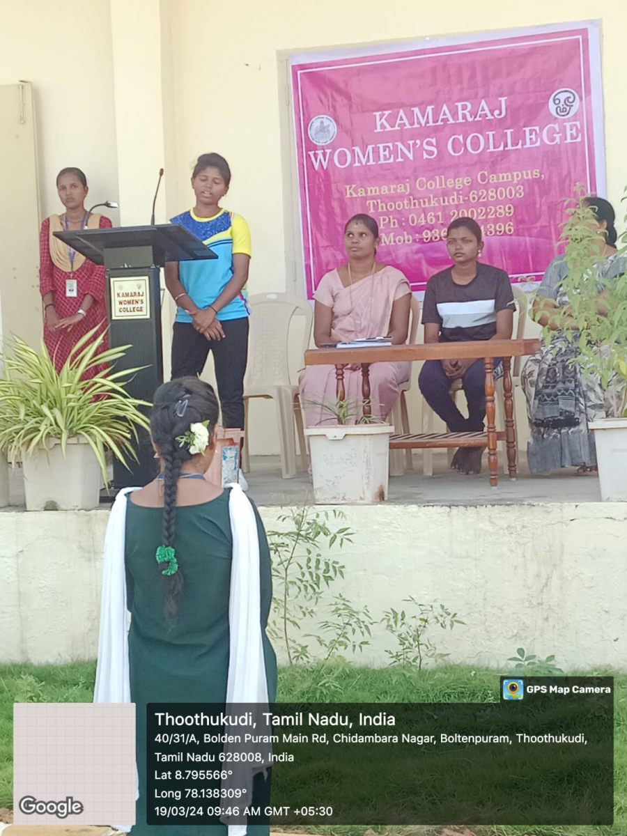 நமது காமராஜ் மகளிர் கல்லூரியில் இன்று (19. 3. 2024 ) தமிழ்த்துறை பாரதியார் மன்றம் சார்பாக மாணவிகளுக்கு ஒரு நாள் பயிற்சி பட்டறையாக சிலம்பம் நடத்தப்பட்டது. இந்நிகழ்ச்சியானது தமிழ்த்தாய் வாழ்த்துடன் இனிதே துவங்கியது. இதில் மாணவிகளுக்கு தன்னம்பிக்கையை வளர்க்கும் விதமாக தற்காப்புக் கலைகளுள் ஒன்றான சிலம்பம் மாணவியர்களுக்கு மாணவியர்களால் கற்றுக் கொடுக்கப்பட்டது. வணிகவியல் துறையைச்சேர்ந்த மாணவிகளான வைஷ்ணவி, காவியா இருவரும் மாணவிகளுக்கு சிலம்பம் கற்றுக் கொடுத்தனர். தமிழர்களின் வீர விளையாட்டான சிலம்பம் பற்றிய செய்திகளையும், இந்த கம்பு சுற்றுதல் மூலம் உடலுக்கும் மனதிற்கும் ஏற்படும் புத்துணர்ச்சி பற்றியும் மாணவி வைஷ்ணவி மாணவிகளுக்கு எடுத்துரைத்தார். இந்நிகழ்ச்சியில் நமது கல்லூரி மாணவிகள் கலந்து கொண்டு பயனடைந்தனர். பின்னர் நாட்டுப்பண்ணுடன் நிகழ்ச்சி இனிதே நிறைவுற்றது. இதில் மாணவி தன்ஸ்லி தொகுப்புரை வழங்கினார்.