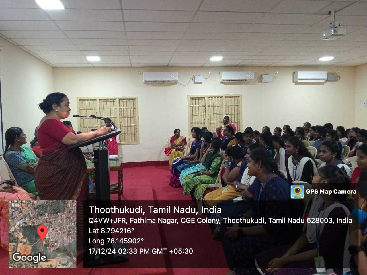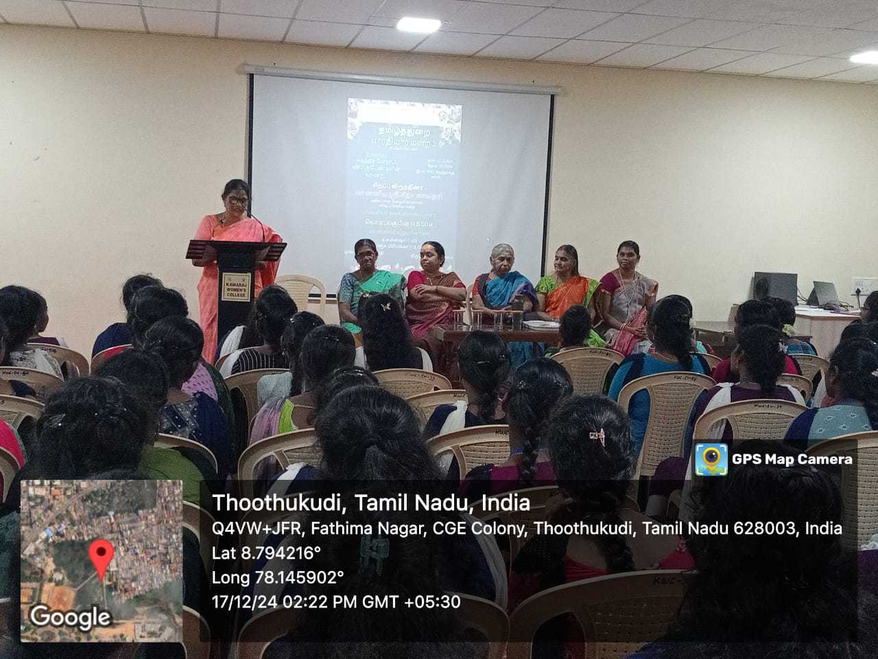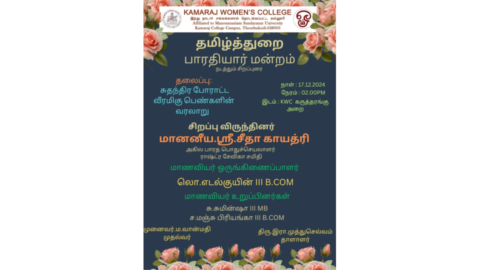 நமது காமராஜ் மகளிர் கல்லூரியில் 17.12.2024 அன்று தமிழ்த்துறை பாரதியார் மன்றம் சார்பாக சுதந்திர போராட்ட வீரமிகு பெண்களின் வரலாறு என்னும் தலைப்பில் சிறப்புரை நடைப்பெற்றது. தமிழ்த்தாய் வாழ்த்துடன் விழா இனிதே துவங்கியது. மாணவி பவித்ரா வரவேற்புரை வழங்கினார். ராஷ்ட்ர சேவிகா சமிதி அகில இந்திய பாரதிய பொதுச் செயலாளர் மானனீய .ஸ்ரீ. சீதா காயத்ரி அவர்கள் சிறப்பு விருந்தினராக கலந்து கொண்டு சிறப்புரை நிகழ்த்தினார். இந்திய வரலாற்றில் பெண்களின் வீரமும் ,தியாகமும் இன்றியமையாதது. இராணி லட்சுமிபாய், சம்பா போன்ற வீரமிகு பெண்களின் வாழ்க்கை நிகழ்வுகளை மிக எளிமையாக எடுத்துரைத்தார். இந்நிகழ்ச்சியில் நூறு மாணவிகள் கலந்து கொண்டு பயனடைந்தார்கள். மாணவி ஆதி நன்றியுரை வழங்க மாணவி சுபஸ்ரீ நிகழ்ச்சியைத் தொகுத்து வழங்கினார். நாட்டுப்பண்ணுடன் விழா இனிதே நிறைவடைந்தது.