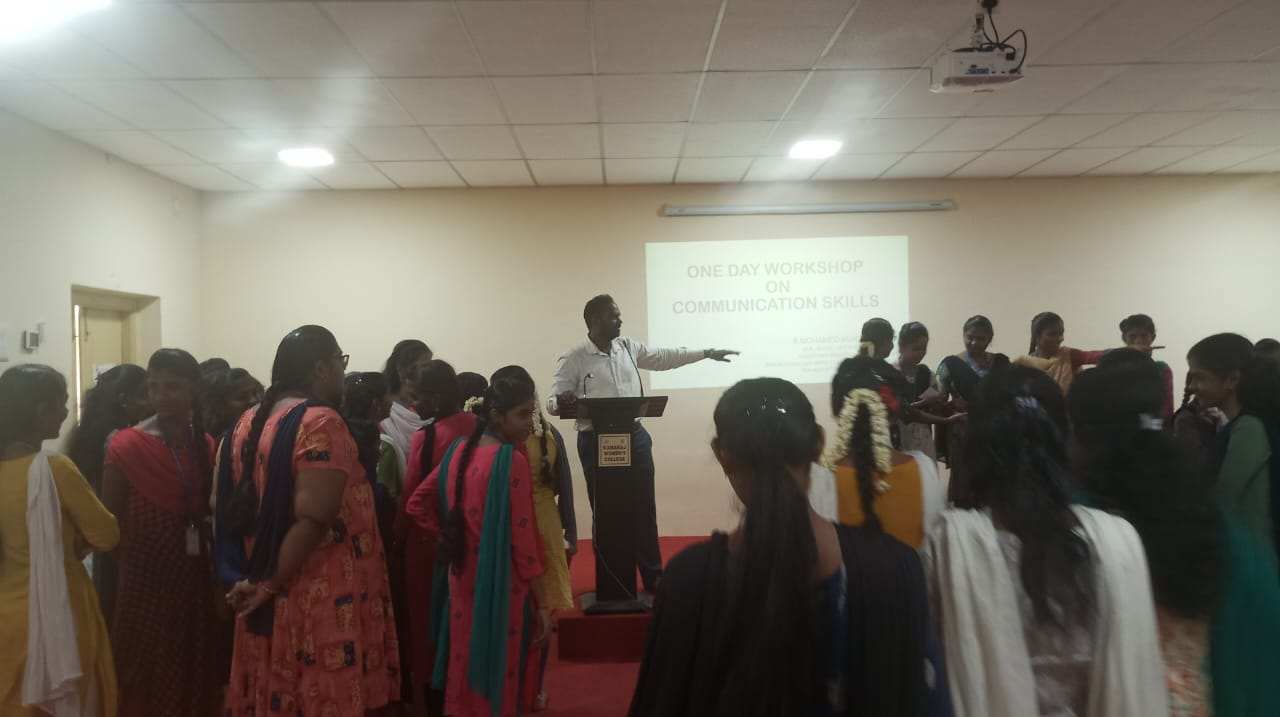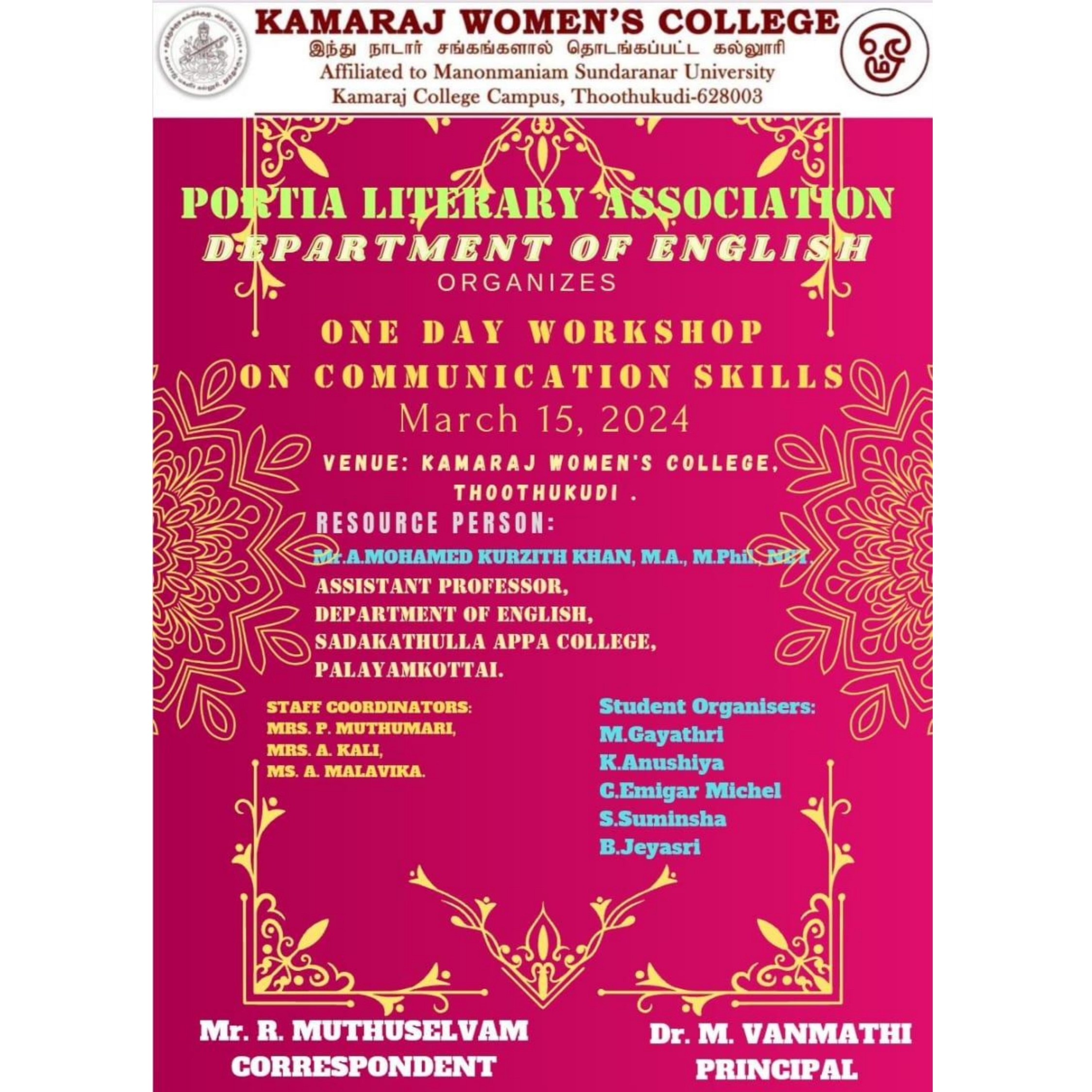 Department of English, Kamaraj Women’s College, Thoothukudi, organized a one-day workshop on communication skills on March 15th, 2024. The event started with college Prayer song. Welcome address was given by K.Kiruthika, student of II B.Sc. Microbiology. Dr.M.Vanmathi,Principal, Kamaraj Women’s College, Thoothukudi addressed the students on the importance of Communication Skills. Mrs.P.Muthumari, Head and Assistant Professor, Department of English, Kamaraj Women’s College, Thoothukudi, gave felicitation speech. Mr. A. Mohamed Kurzith Khan, Assistant Professor, Department of English, Sadakathullah Appa College, Palayamkottai, conducted the workshop. The session was highly interactive. The workshop came to an end with Vote of thanks by C.Emigar Michel, student of II B.Sc. Fashion Technology. Students gave their feedback that the workshop was very useful for them.