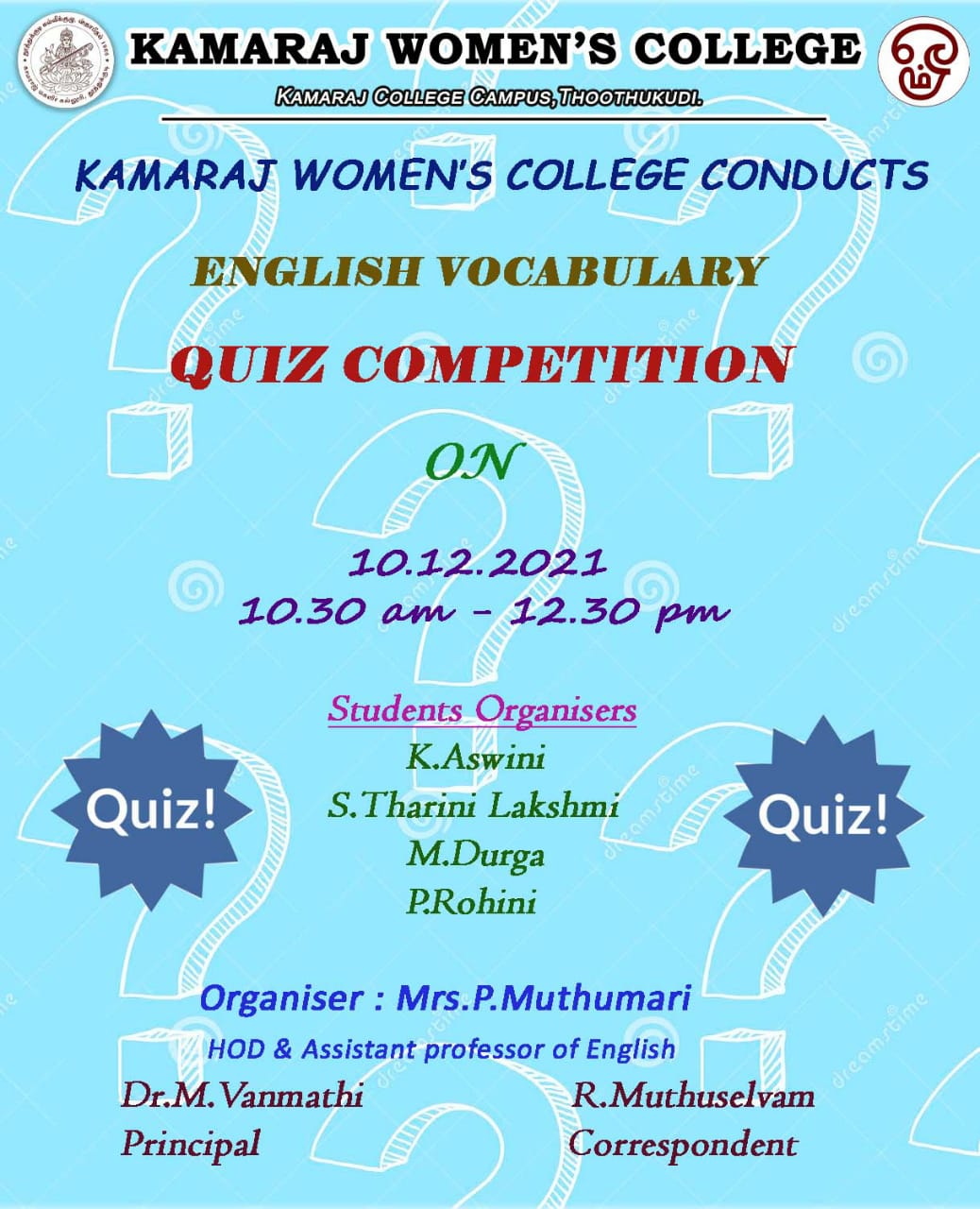 ENGLISH VOCABULARY QUIZ COMPETITION Kamaraj Women’s College conducted an English Vocabulary Quiz Competition for all the First year students on 10-12-2021. They were provided with an opportunity to acknowledge their merit and outstanding endeavor to learn English. Date Dec 10 2021 Expired! Time 10:30 am Share this event