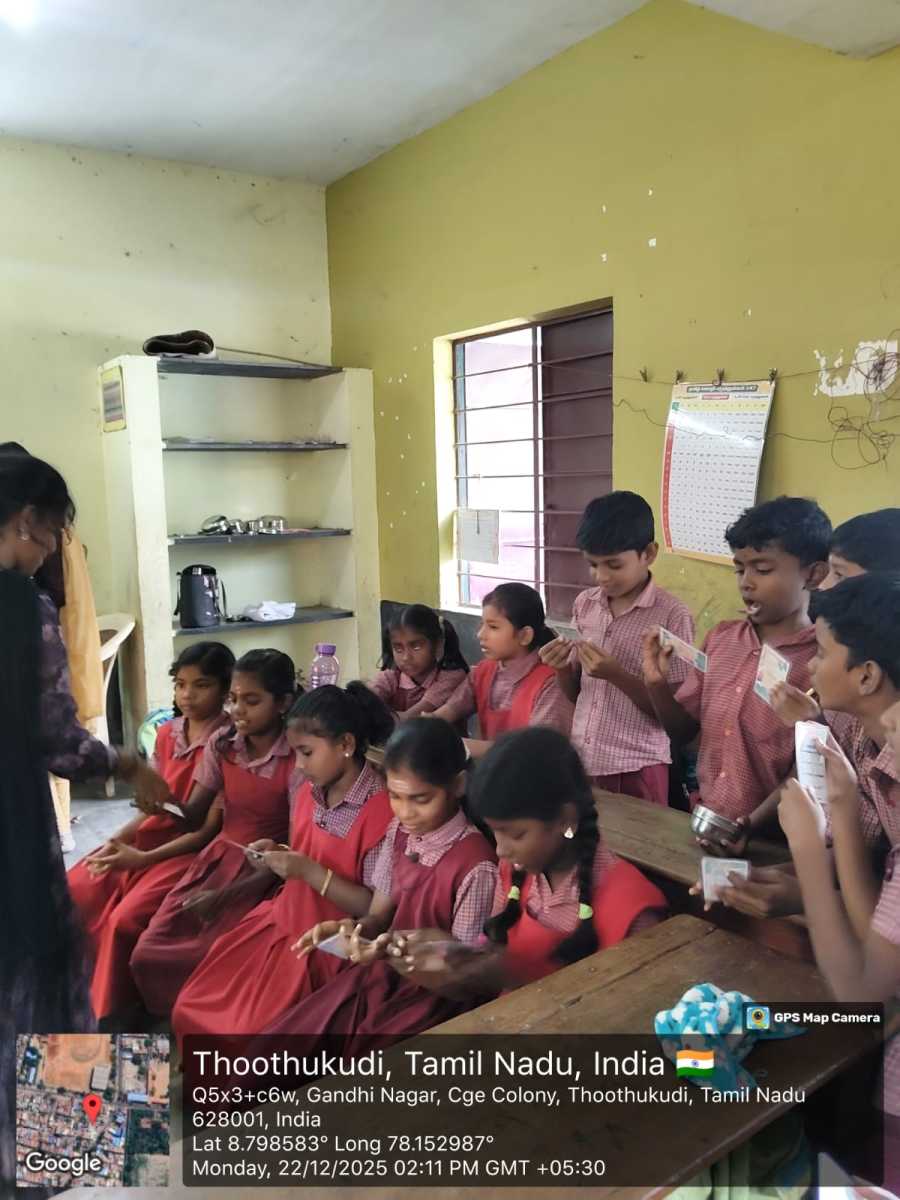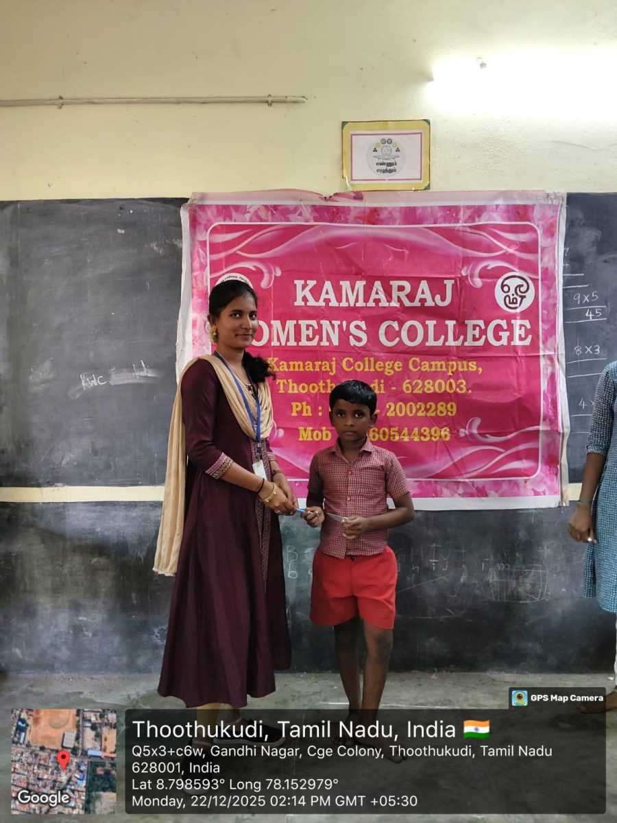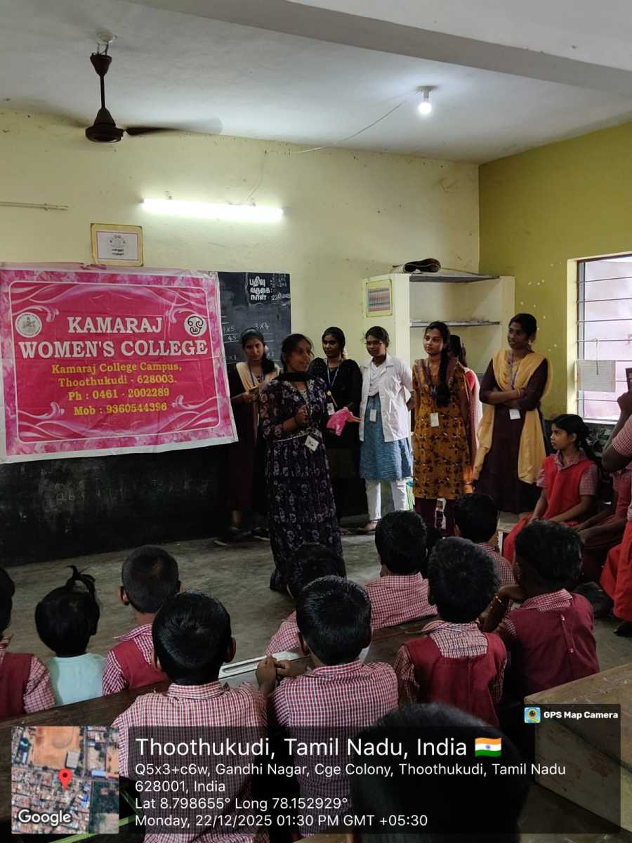 The Department of Commerce and Banking & Finance, Kamaraj Women’s College, Thoothukudi, organized an Extension Activity by Department of Commerce and Banking Finance on 22 December 2025 at Gandhi Nagar Primary School, Thoothukudi. The programme focused on community engagement, social awareness, and student personality development.