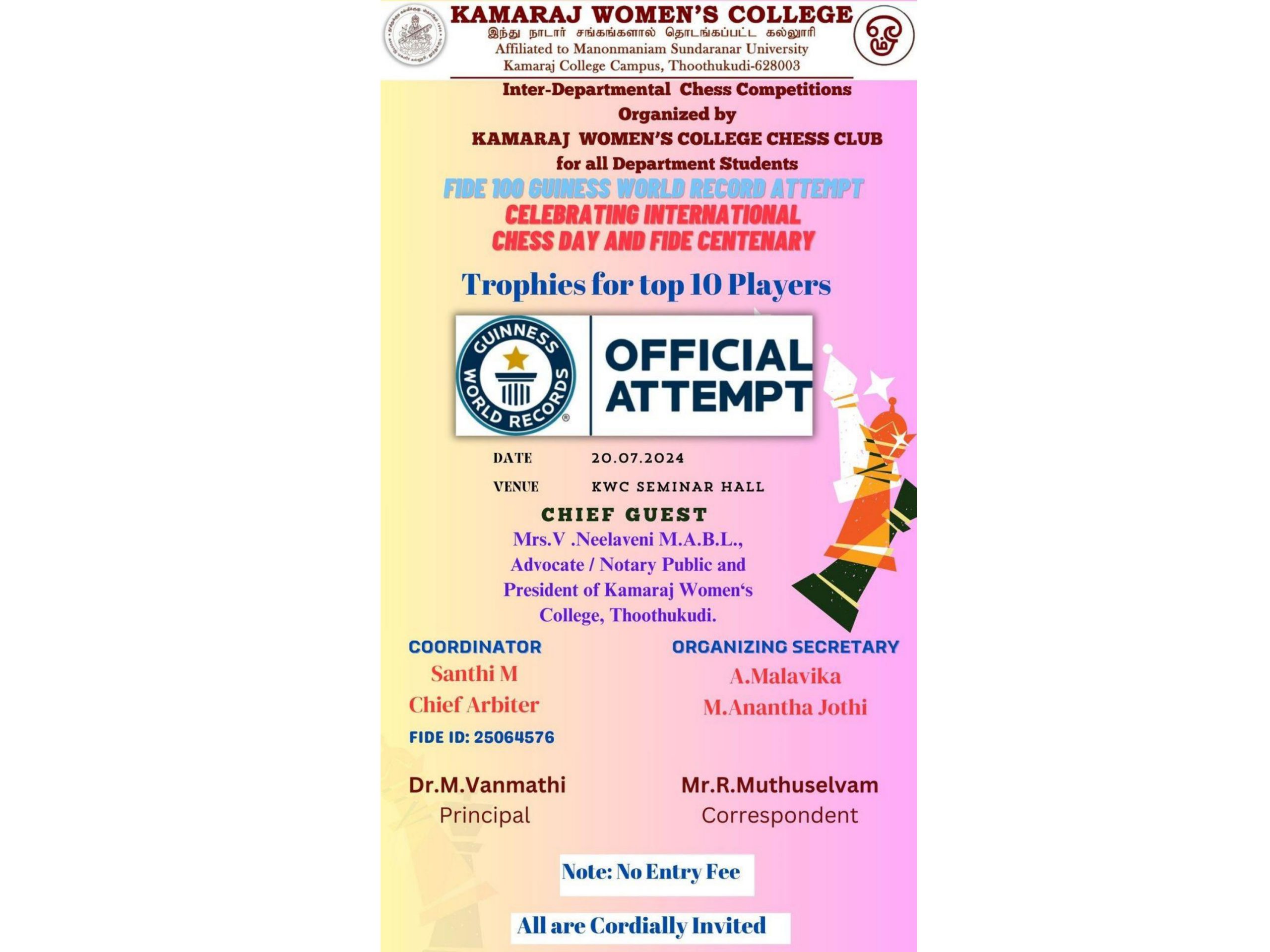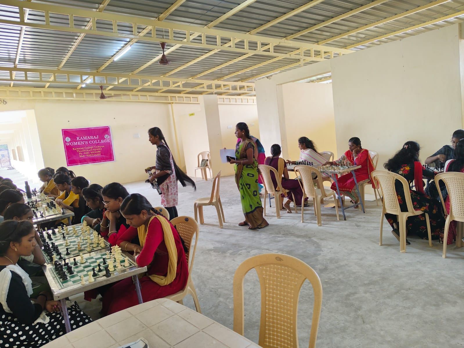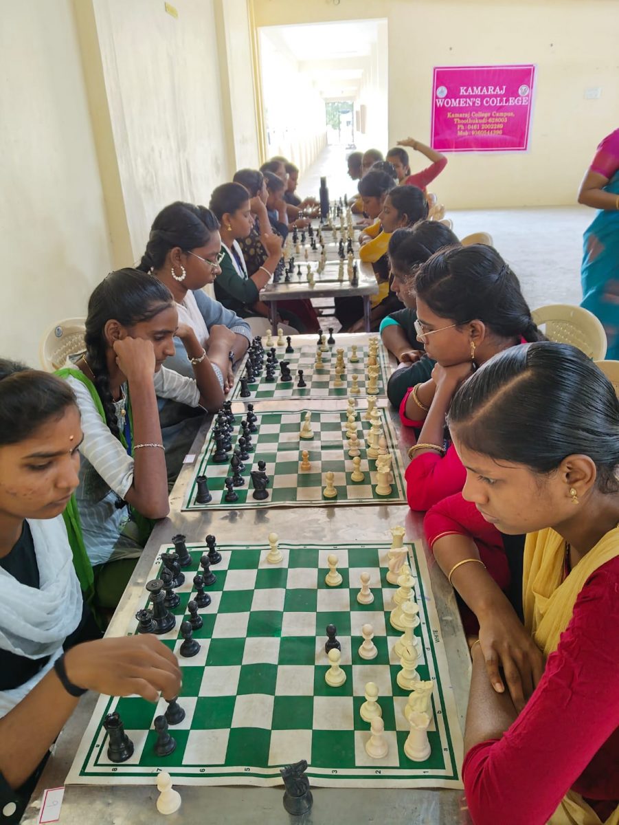 On 20th July 2024, Kamaraj Women’s College, Chess Club organised interdepartmental chess competitions to celebrate International Chess Day and the FIDE centenary of hundred Guinness world record attempts around 40 students from various departments actively participated. Mrs M Shanti chief arbiter helped to conduct the competition, Mrs.V. Neelaveni mam, MA BL, advocate and president of Kamaraj Women’s College was the chief guest and distributed the trophies for the best 10 players program came to an end with the national anthem.