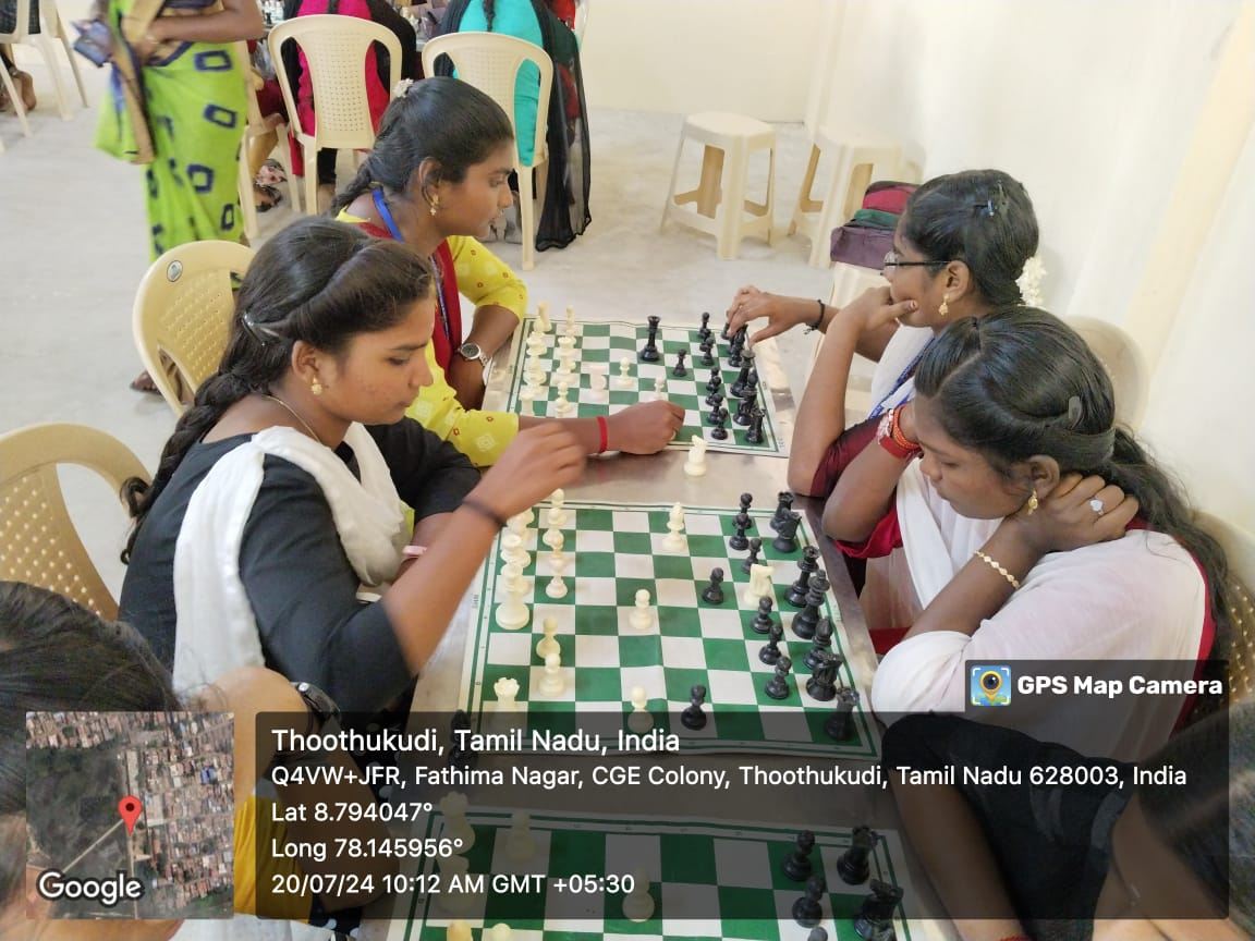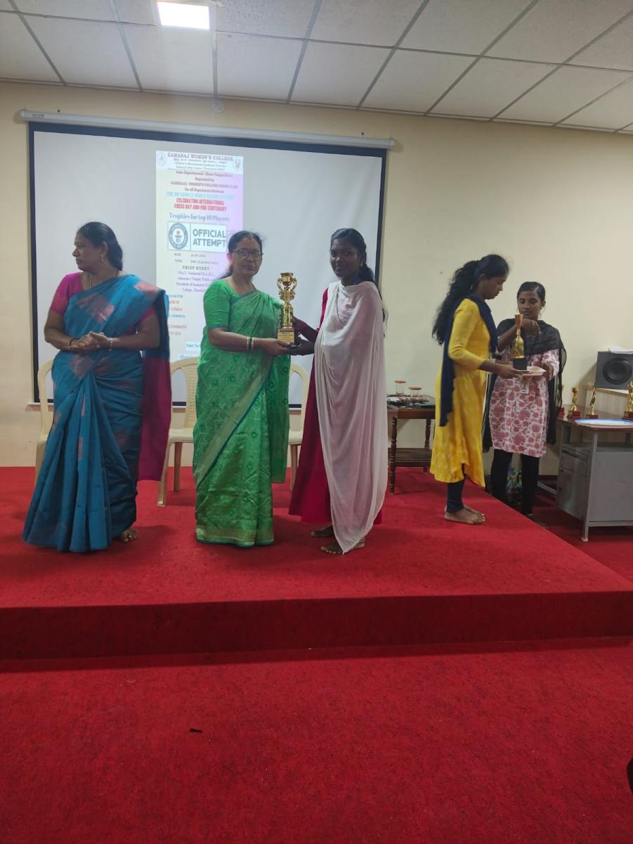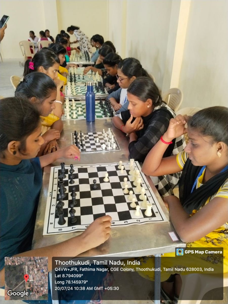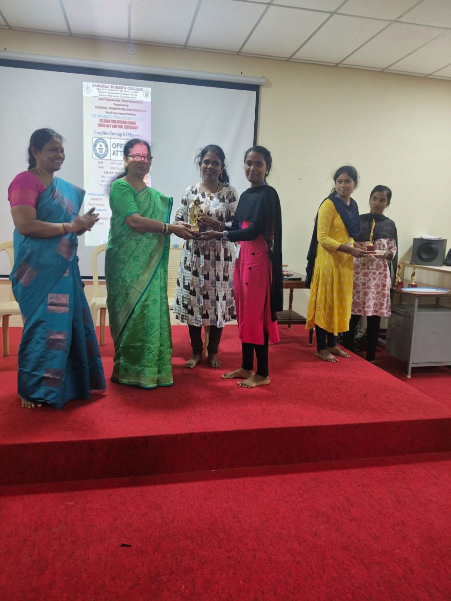 On 20th July 2024, Kamaraj Women’s College, Chess Club organised interdepartmental chess competitions to celebrate International Chess Day and the FIDE centenary of hundred Guinness world record attempts around 40 students from various departments actively participated. Mrs M Shanti chief arbiter helped to conduct the competition, Mrs.V. Neelaveni mam, MA BL, advocate and president of Kamaraj Women’s College was the chief guest and distributed the trophies for the best 10 players program came to an end with the national anthem.