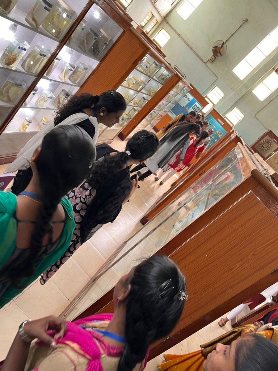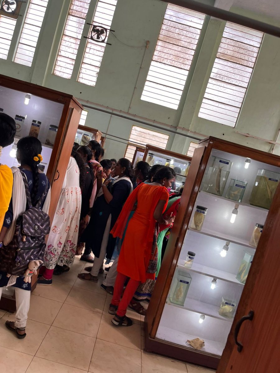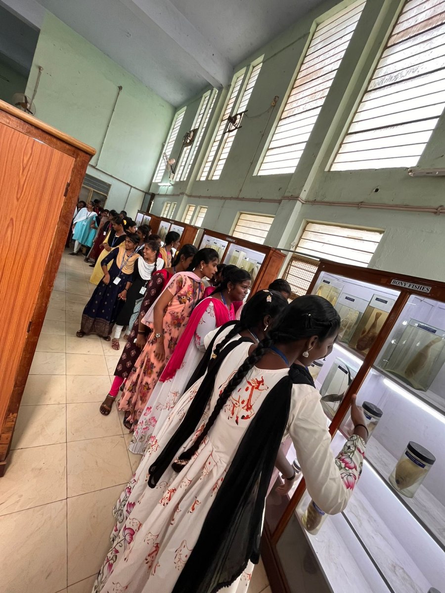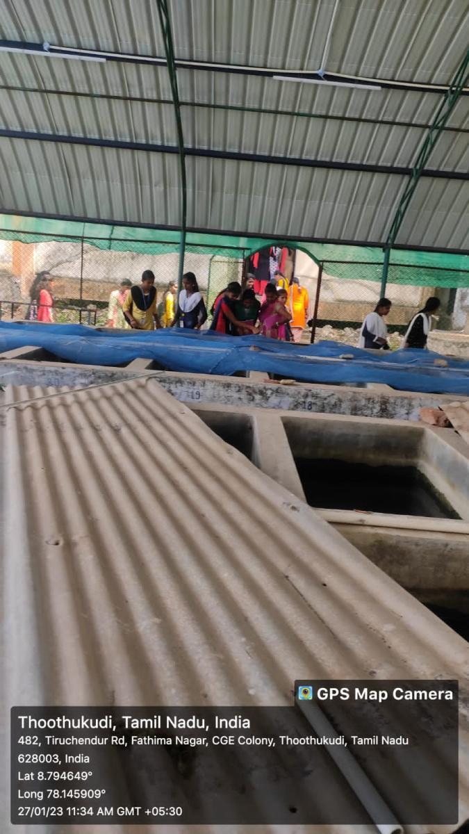 Kamaraj Women’s College students visited Fisheries College and Research Institute Thoothukudi on 27.1.2023 for their educational and career purposes. Hundred and thirty-eight students and seven staff members visited the field trip. The students gained significant facts and figures regarding the science of marine fisheries. The students gathered knowledge about marine bio diversities such as Urchins, Crustaceans, Mollusca, and Poriferans.