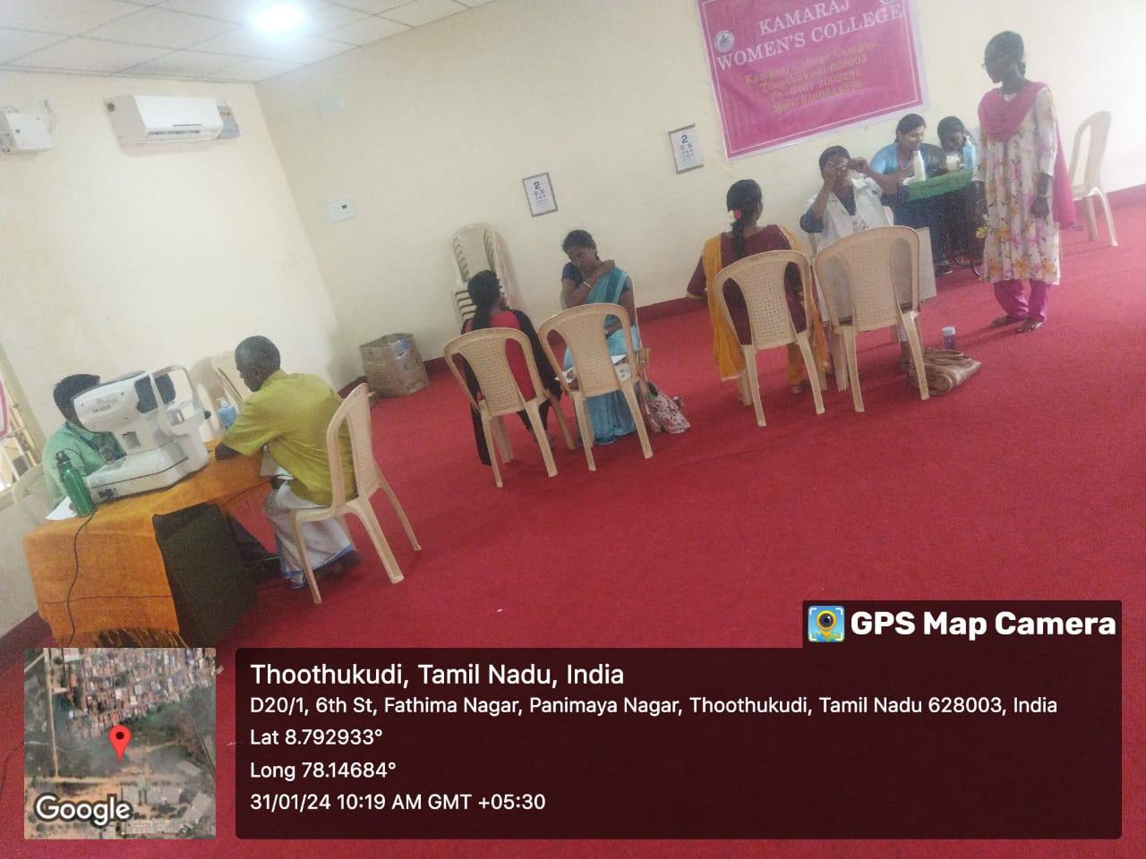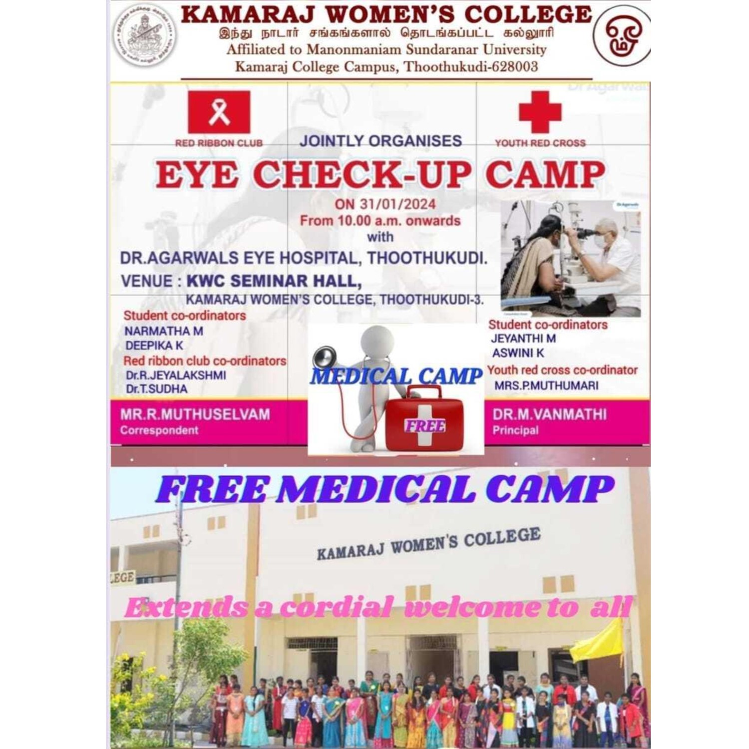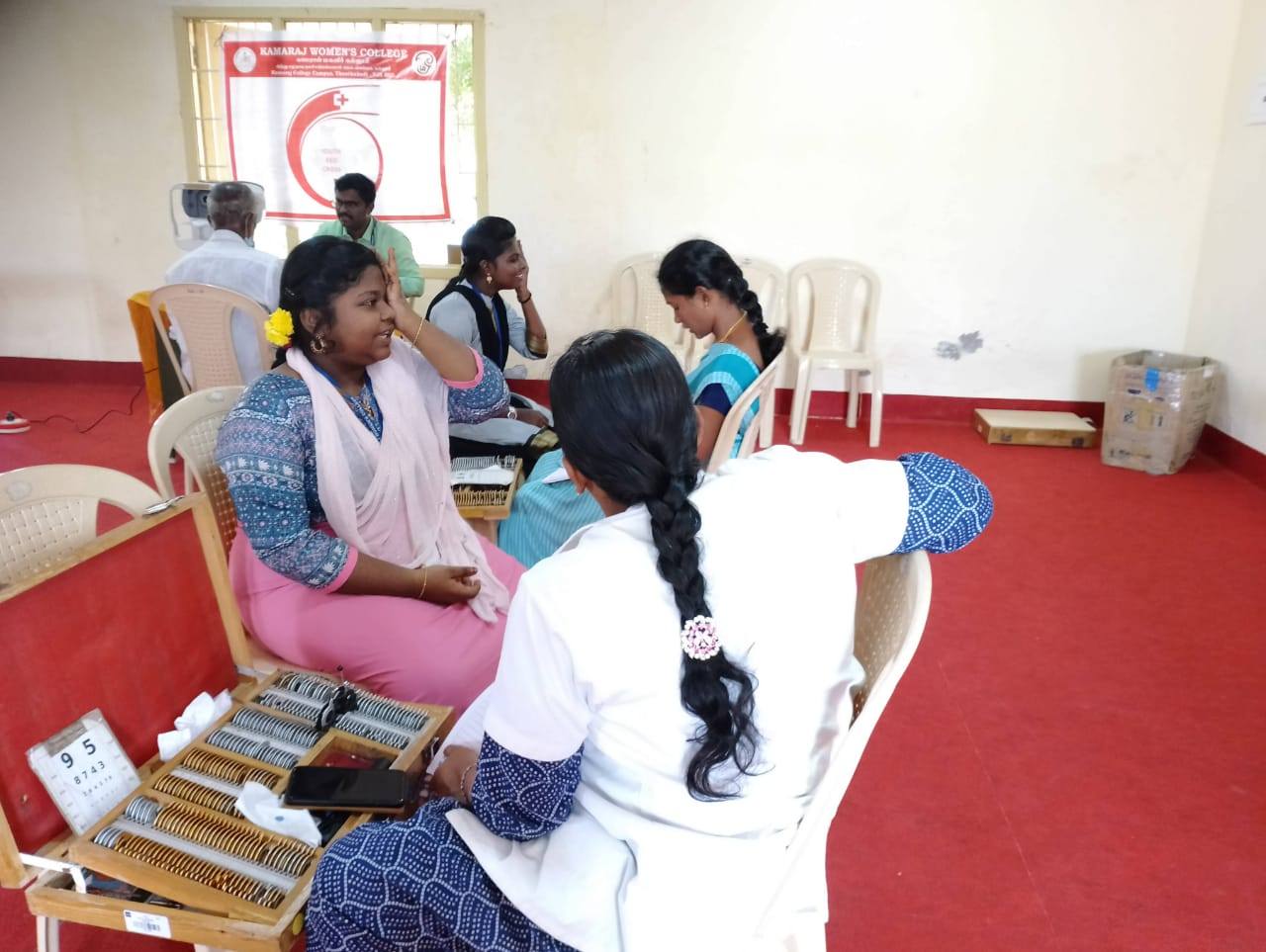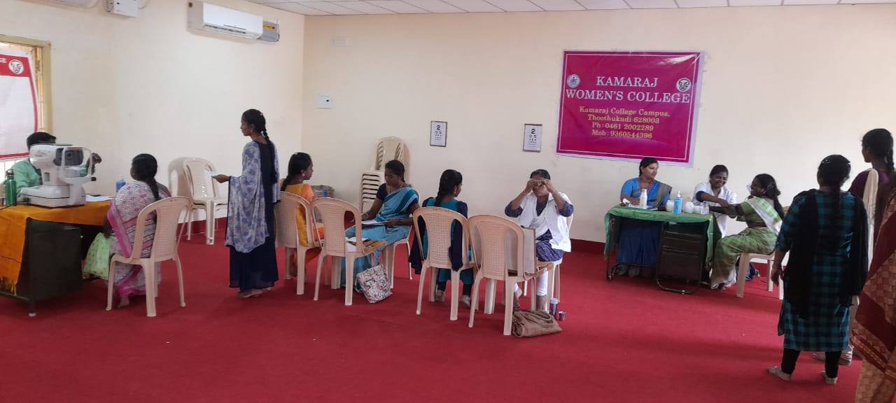 ஐம்புலன்களில் ஒன்றான கண் பரிசோதனை , சர்க்கரை நோய் மற்றும் இரத்த அழுத்தம் பரிசோதித்தல் ஆகியவற்றிற்கான மருத்துவ முகாம் நமது காமராஜ் மகளிர் கல்லூரியில் 31.01.2024 அன்று RRC மற்றும் YRC சார்பாக நடைபெற்றது. இதில் டாக்டர் அகர்வால் கண் மருத்துவமனையிலிருந்து டாக்டர் அழகு லிங்கம் அவர்கள் வருகை புரிந்து கண்களின் பார்வை குறைபாட்டிற்குக் காரணம், கண்களைப் பாதுகாக்கும் முறை ,கண் தானம் செய்யும் முறை ஆகியவற்றை பற்றி எடுத்துரைத்தார் . இந்த மருத்துவ முகாமில் பொதுமக்களும், எமது கல்லூரி மாணவிகளும் ,ஆசிரியர்களும் கலந்து கொண்டு தங்களின் கண்களை பரிசோதனை செய்து பயனடைந்தனர்.