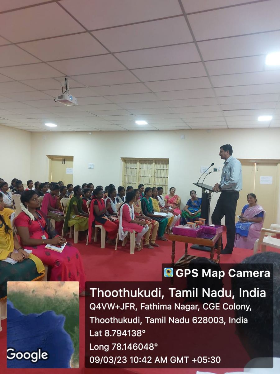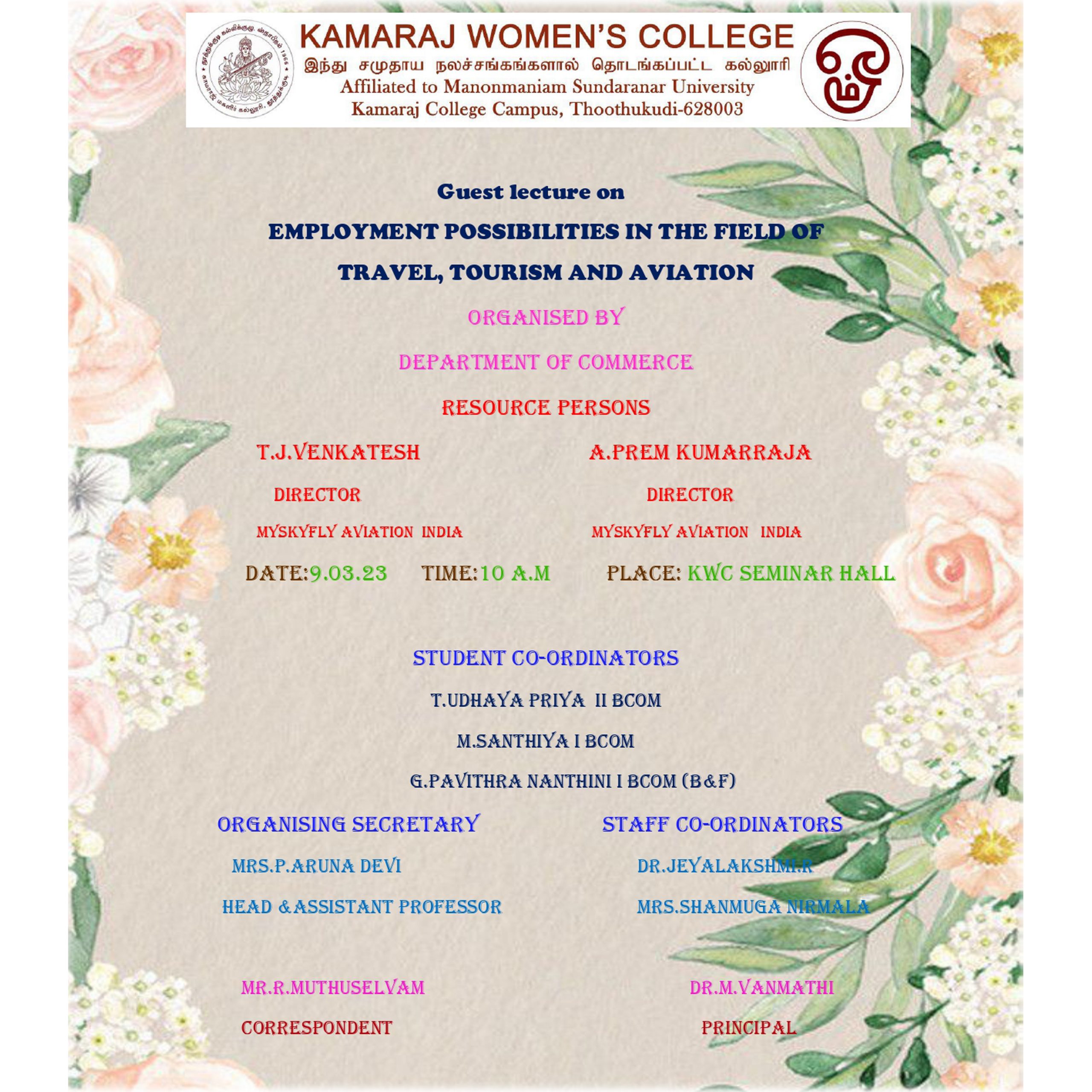 The department of commerce, Kamaraj women’s College, conducted a Guest Lecture Program on Employment Possibilities in the Field of Travel, Tourism, and Aviation on 9.3.2023 at 10 a.m. Resource persons T.J.Venkatesh and A.Premkumarraja came from Myskyfly India. They delivered information about various job opportunities in airports and airlines, how to join them, the pay scale, the qualifications and skills required, the kinds of jobs, and the needed language, physical qualifications, and communication skills. During the guest lecture program, students asked many questions related to employment opportunities to resource persons, and students understood the clear way to get a job in the aviation field. Eighty students participated in the guest lecture program.