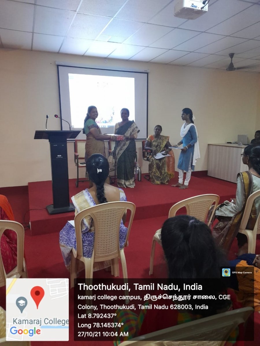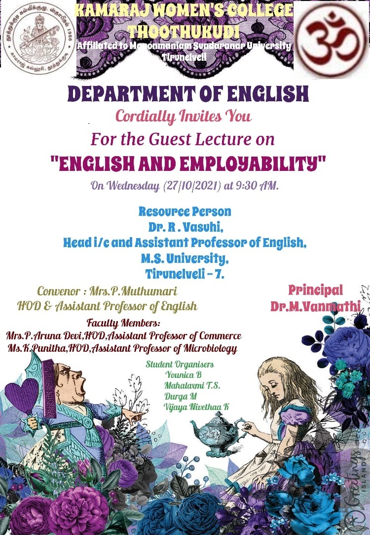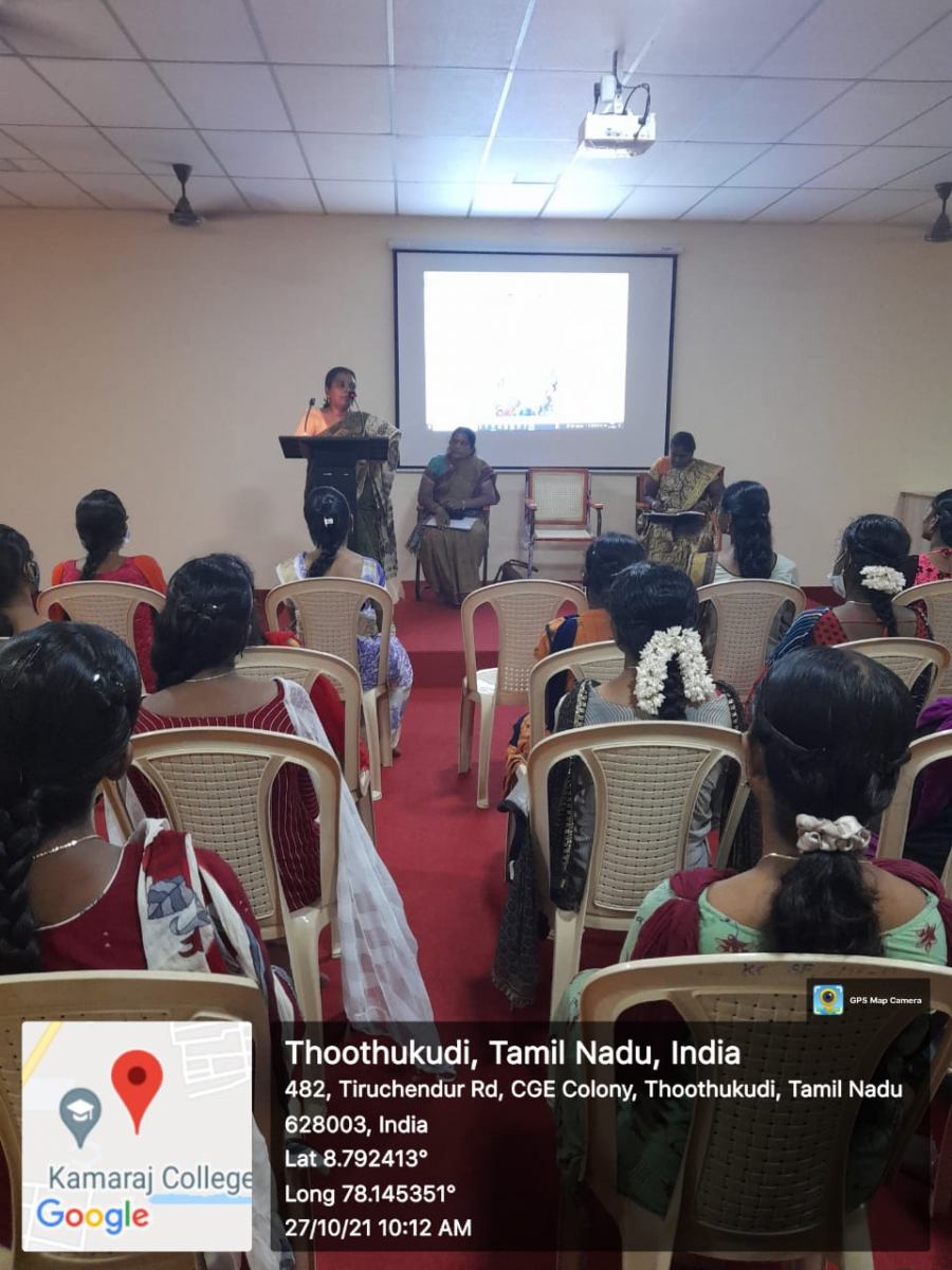 Kamaraj Women’s College Organized a Guest Lecture on English and Employability on 27.10.2021 at 9.30 am. Dr. R. Vasuhi, Head i/c and Assistant Professor of English, M. S. University, Tirunelveli, was invited for the Guest Lecture. Students Miss. B. Younica, Miss. T. S. Mahalaxmi, Miss. M. Durga & Miss. K. Vijaya Nivethaa Organized the Event. She guided the students in developing their communication skills in English which is very essential for improving their employability skills.