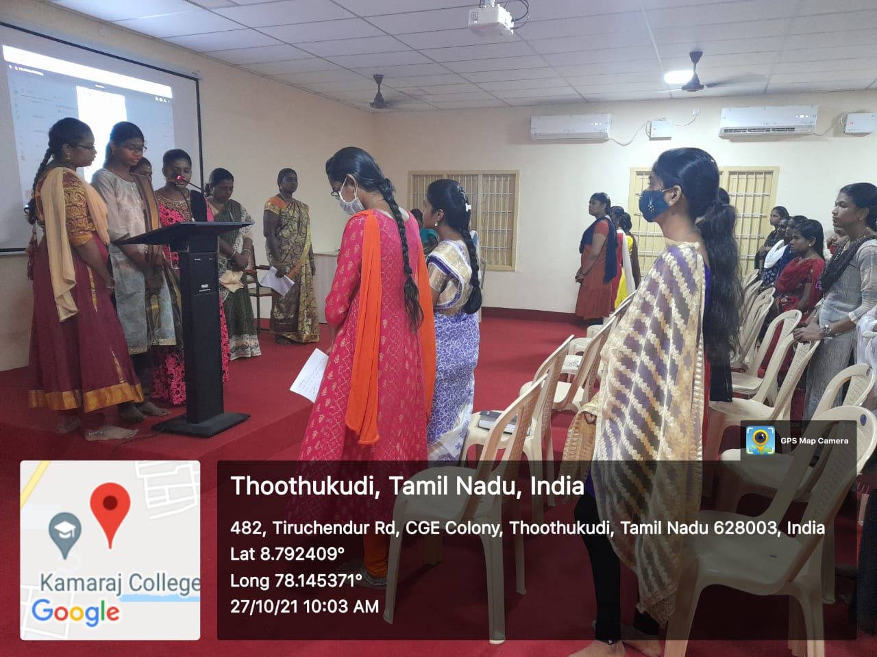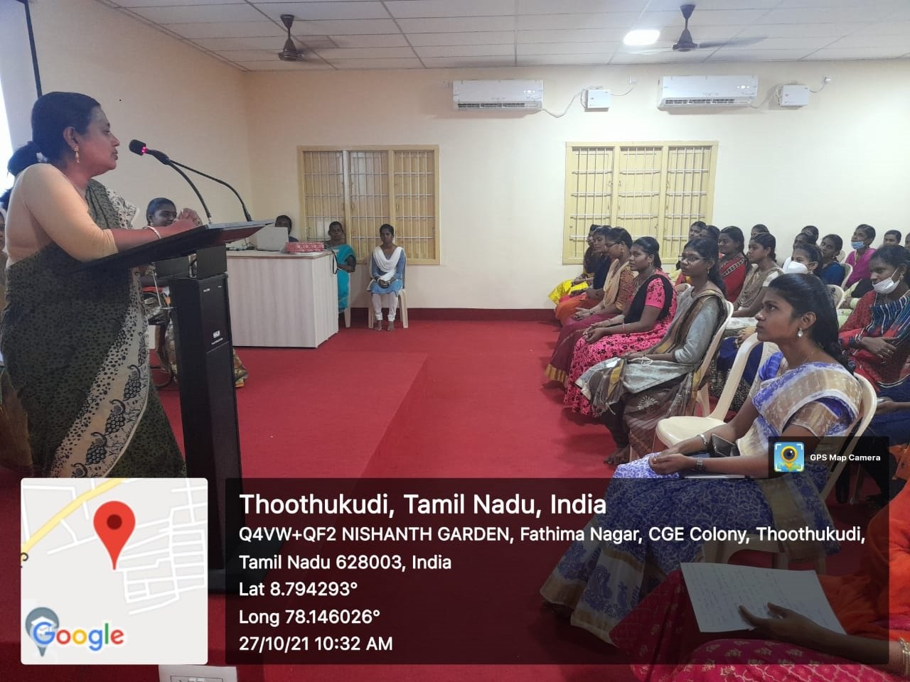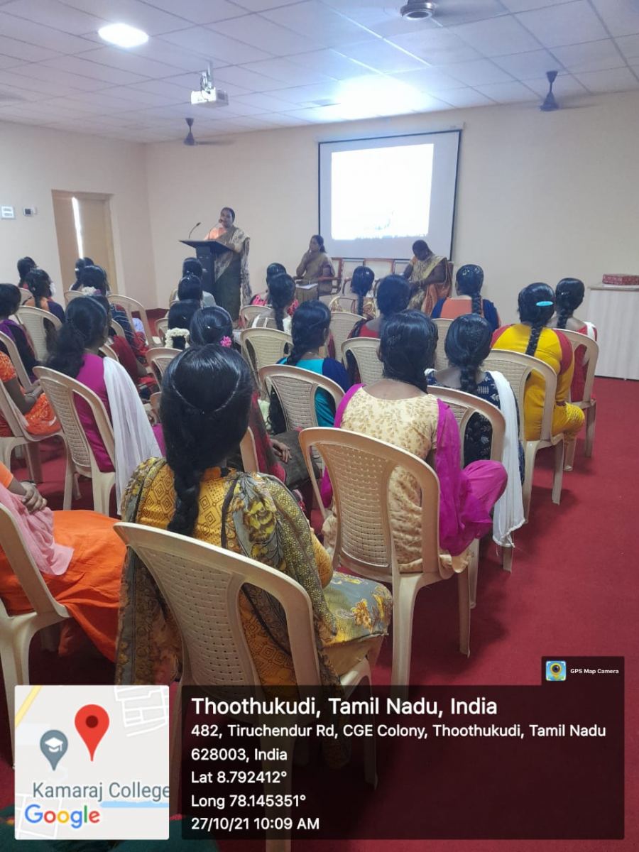 Kamaraj Women’s College Organized a Guest Lecture on English and Employability on 27.10.2021 at 9.30 am. Dr. R. Vasuhi, Head i/c and Assistant Professor of English, M. S. University, Tirunelveli, was invited for the Guest Lecture. Students Miss. B. Younica, Miss. T. S. Mahalaxmi, Miss. M. Durga & Miss. K. Vijaya Nivethaa Organized the Event. She guided the students in developing their communication skills in English which is very essential for improving their employability skills.