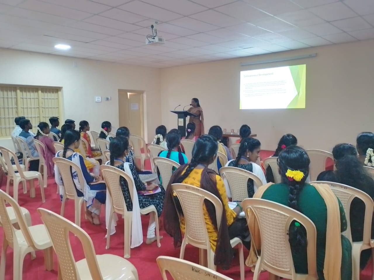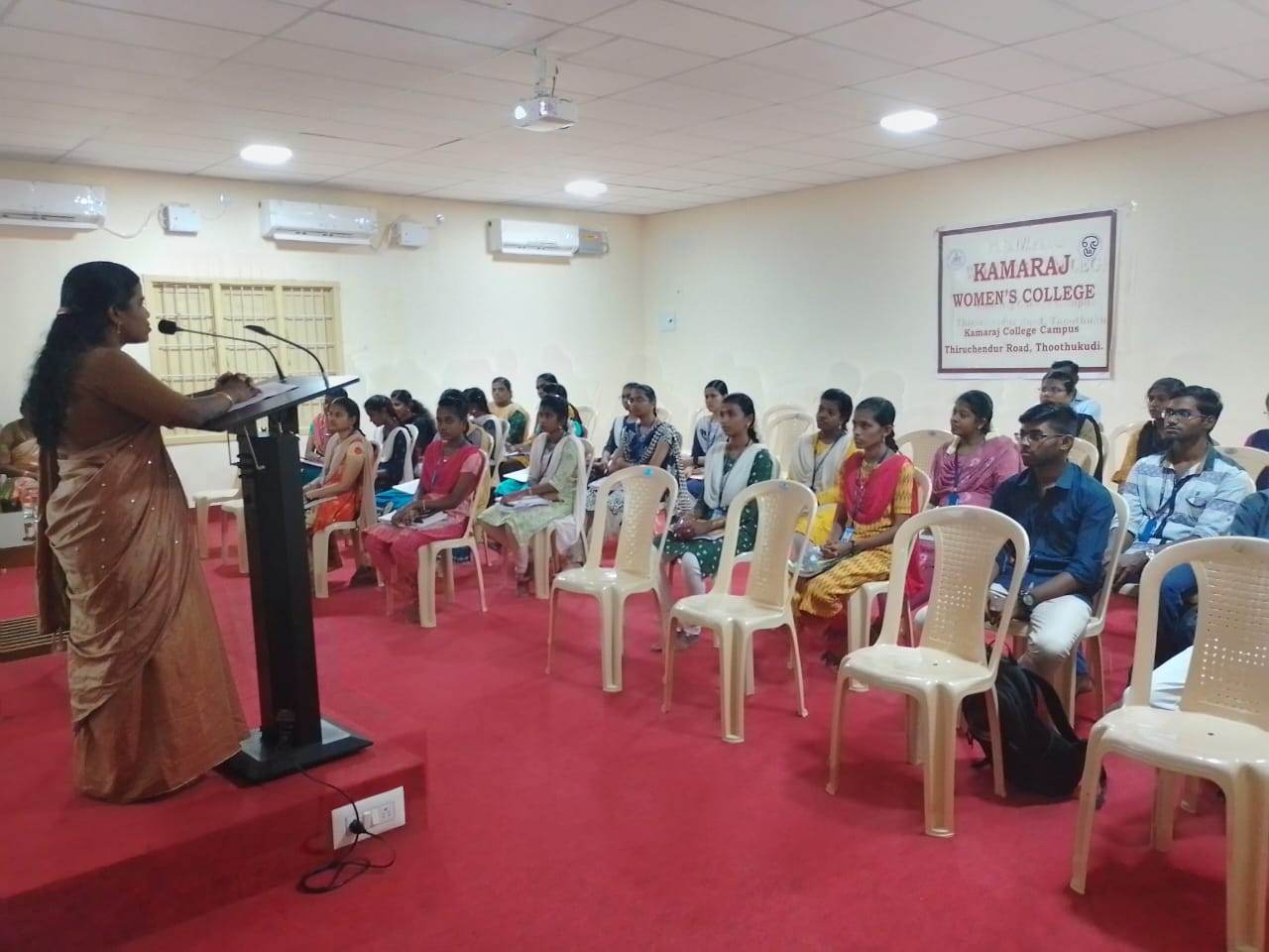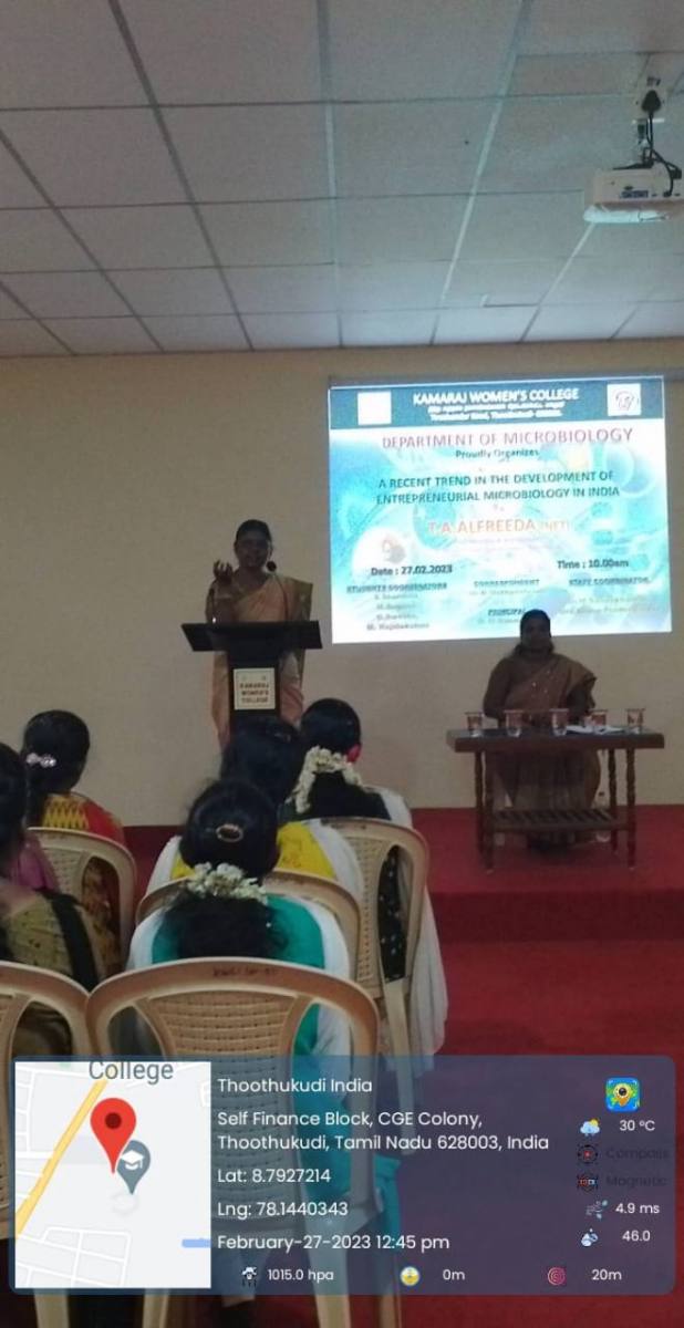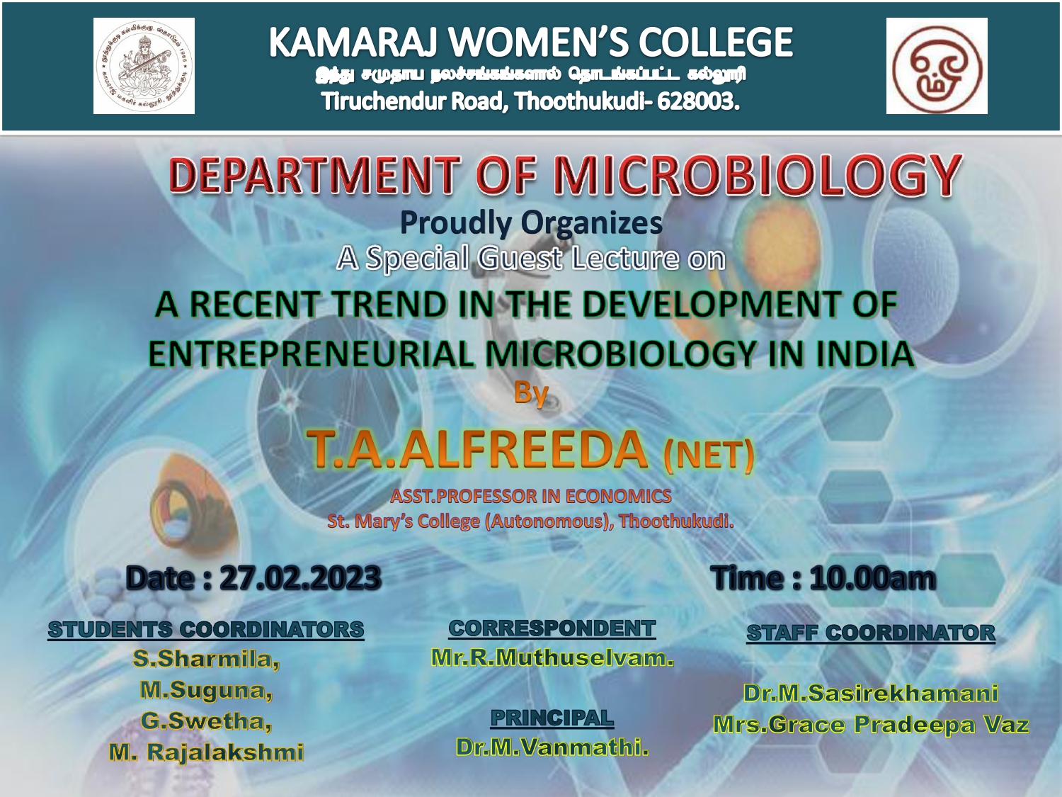 The Department of Microbiology, Kamaraj women’s college, Thoothukudi conducted a Guest Lecture on the title ” Recent Trends in Developments in Entrepreneurial Microbiology in India ” on 27 -2-2023. Mrs.T.A.Alfreeda , Asst.Professor, Dept of Economics ,St.Mary’s college, Thoothukudi was the Chief Guest. The students were able to get a clear picture of the various aspects regarding the Start up plans necessary to be an entrepreneur. Microbiology students of Kamaraj college also attended the programme. The lecture proved to be worthwhile to the students of the department.