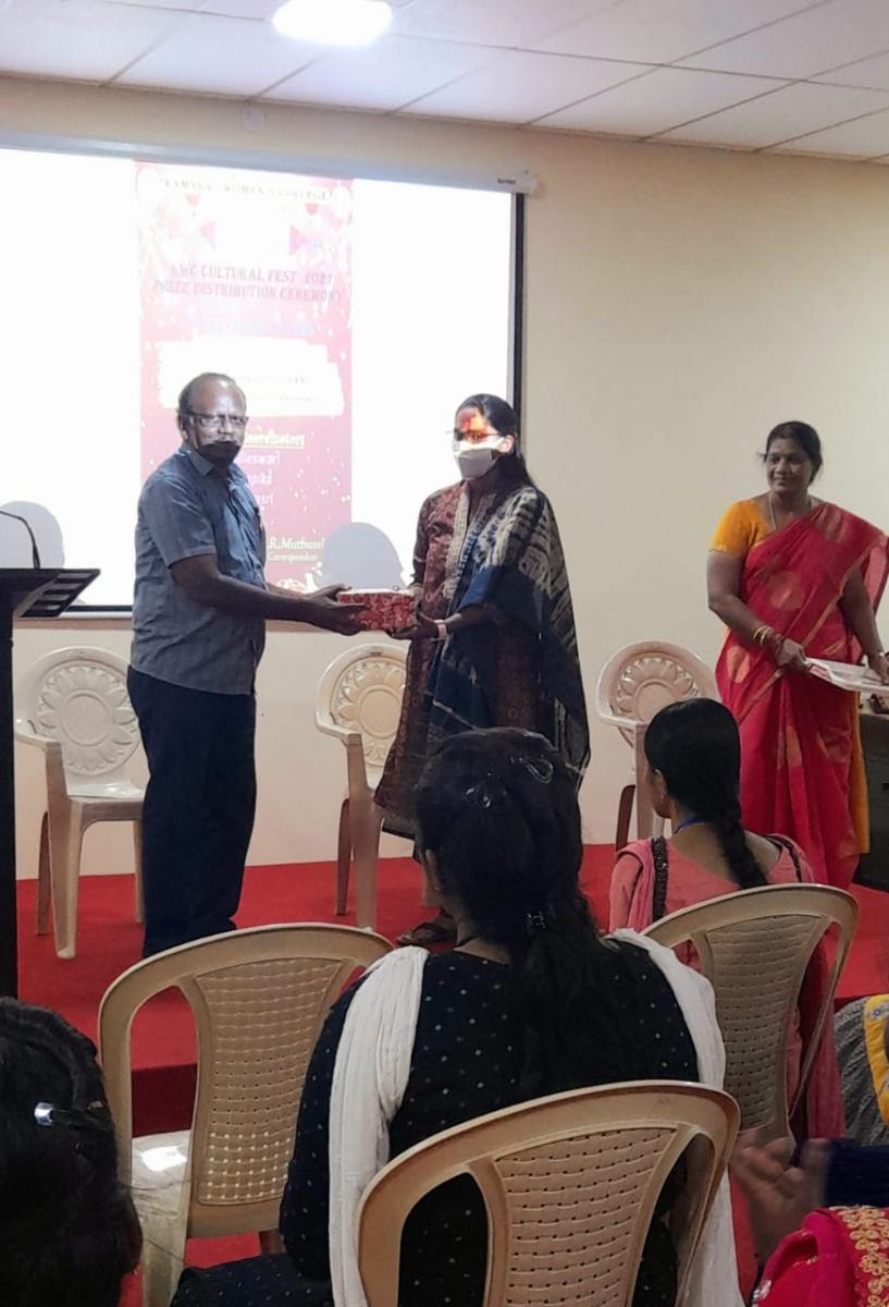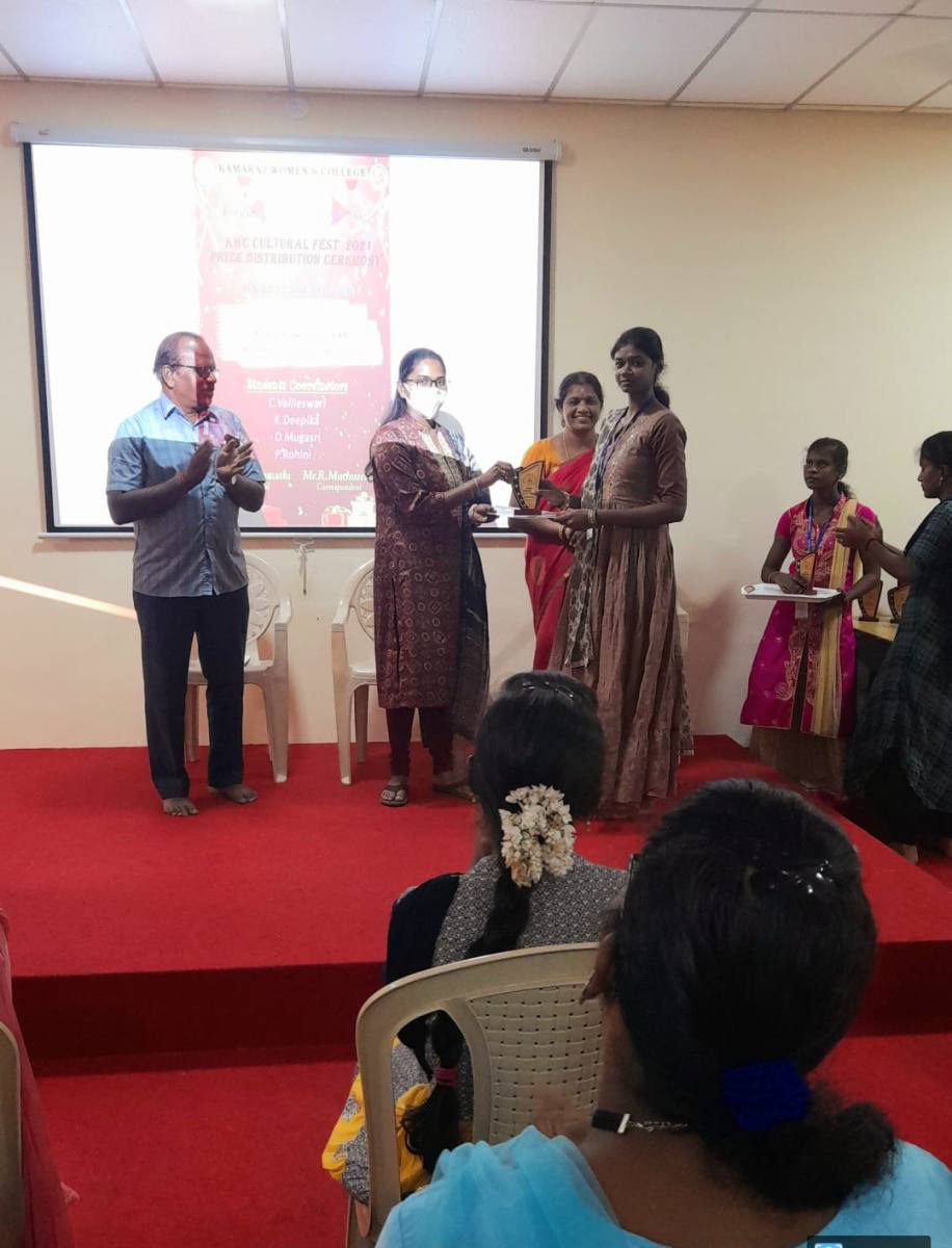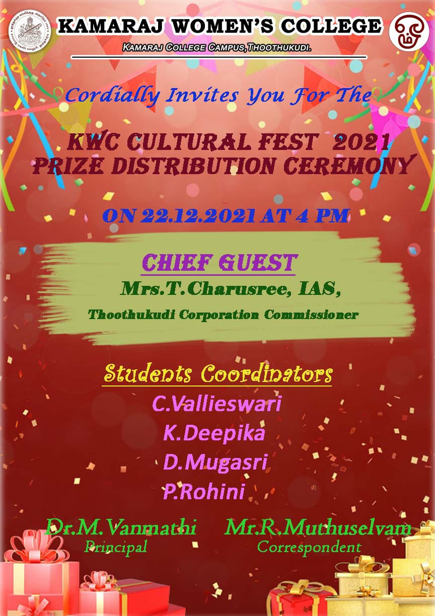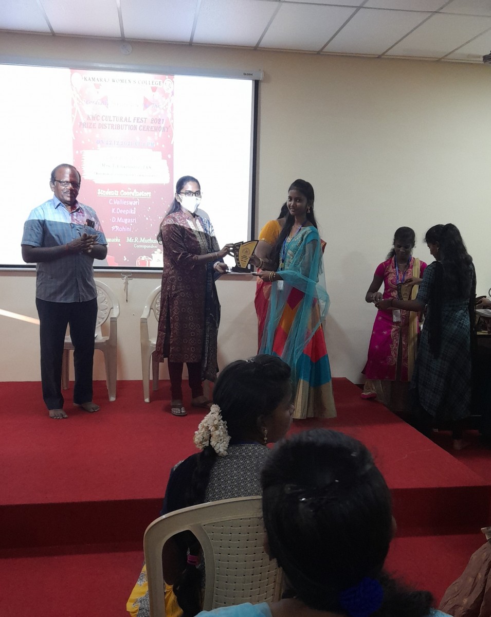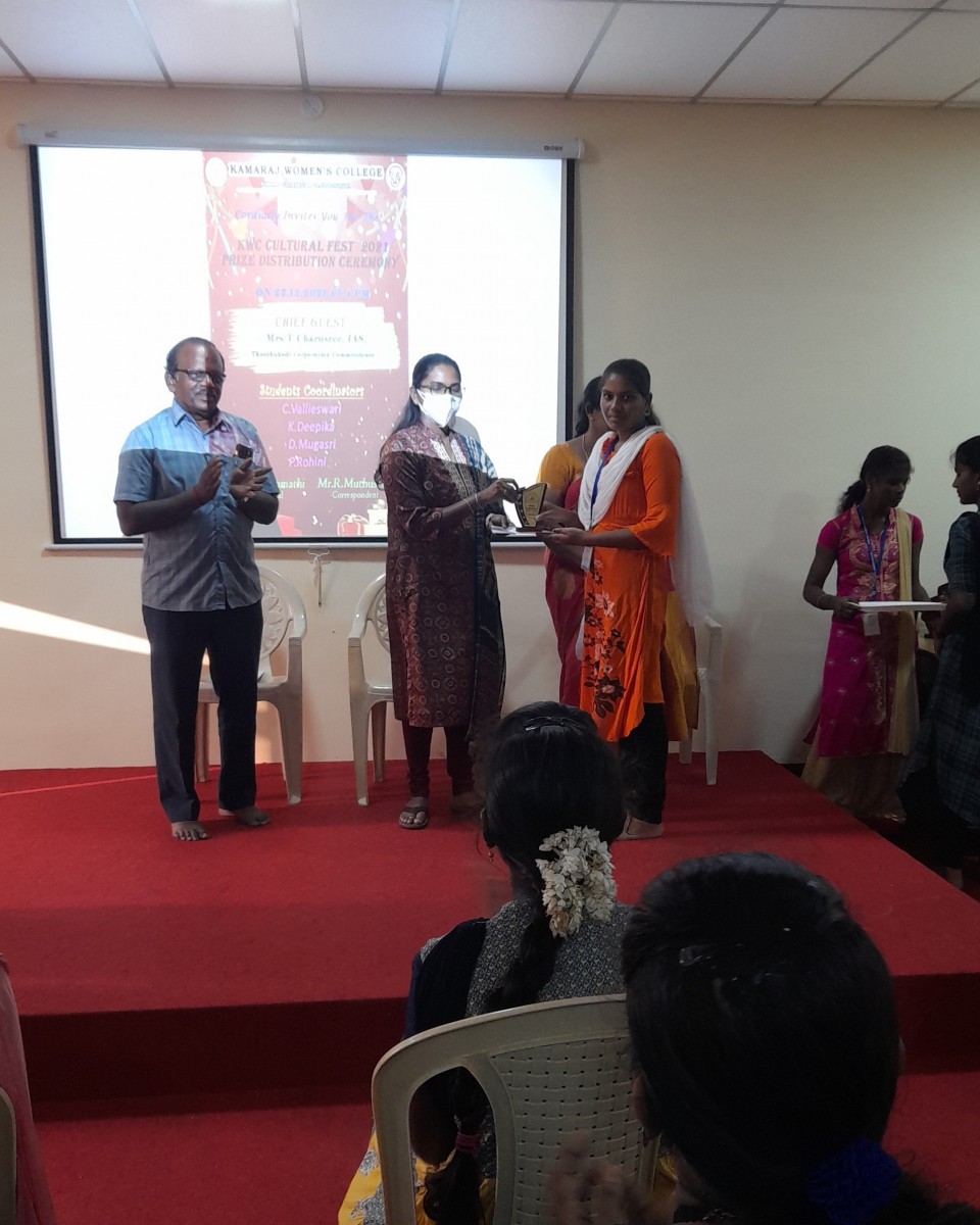 Kamaraj Women’s College, Thoothukudi organized KWC Cultural Fest 2021 Prize Distribution Ceremony on 22/12/2021. Mrs. T. Charusree, IAS, Thoothukudi Corporation Commissioner was the Chief Guest for the Programme. She addressed the students before distributing the Shields and Certificates to the winners of the various Cultural Competitions of the year 2021. Through her speech, she motivated students to study well for a bright future. She told the students that College life is the foundation for their careers. Students Miss.C. Vallieswari, Miss. K. Deepika, Miss. D. Mugasri, Miss. P. Rohini organized the event. Students received their Shields and Certificates from such an ebullient woman who can be a role model for them.
