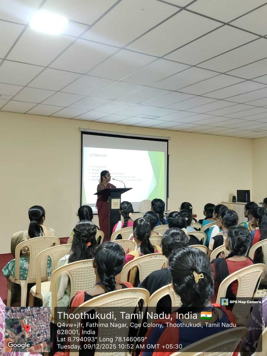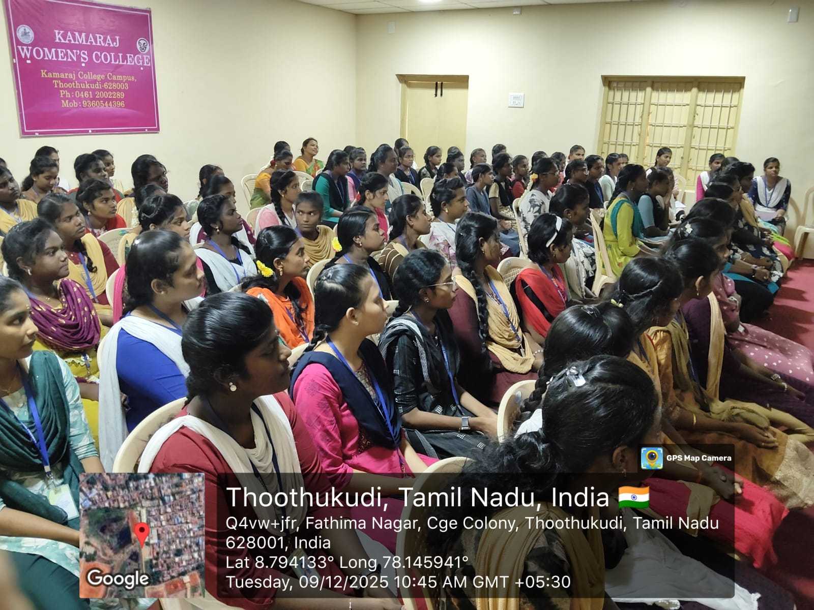 The Department of English at Kamaraj Women’s College organized an enriching guest lecture on 9 December 2025 on the topic Literature as a Pathway to Human Values. The session was delivered by Dr. K. Kalyani, an eminent academician and Assistant Professor of English at Kamaraj College, Thoothukudi. The event aimed to help students understand how literature shapes character, inspires reflection, and strengthens ethical thinking.