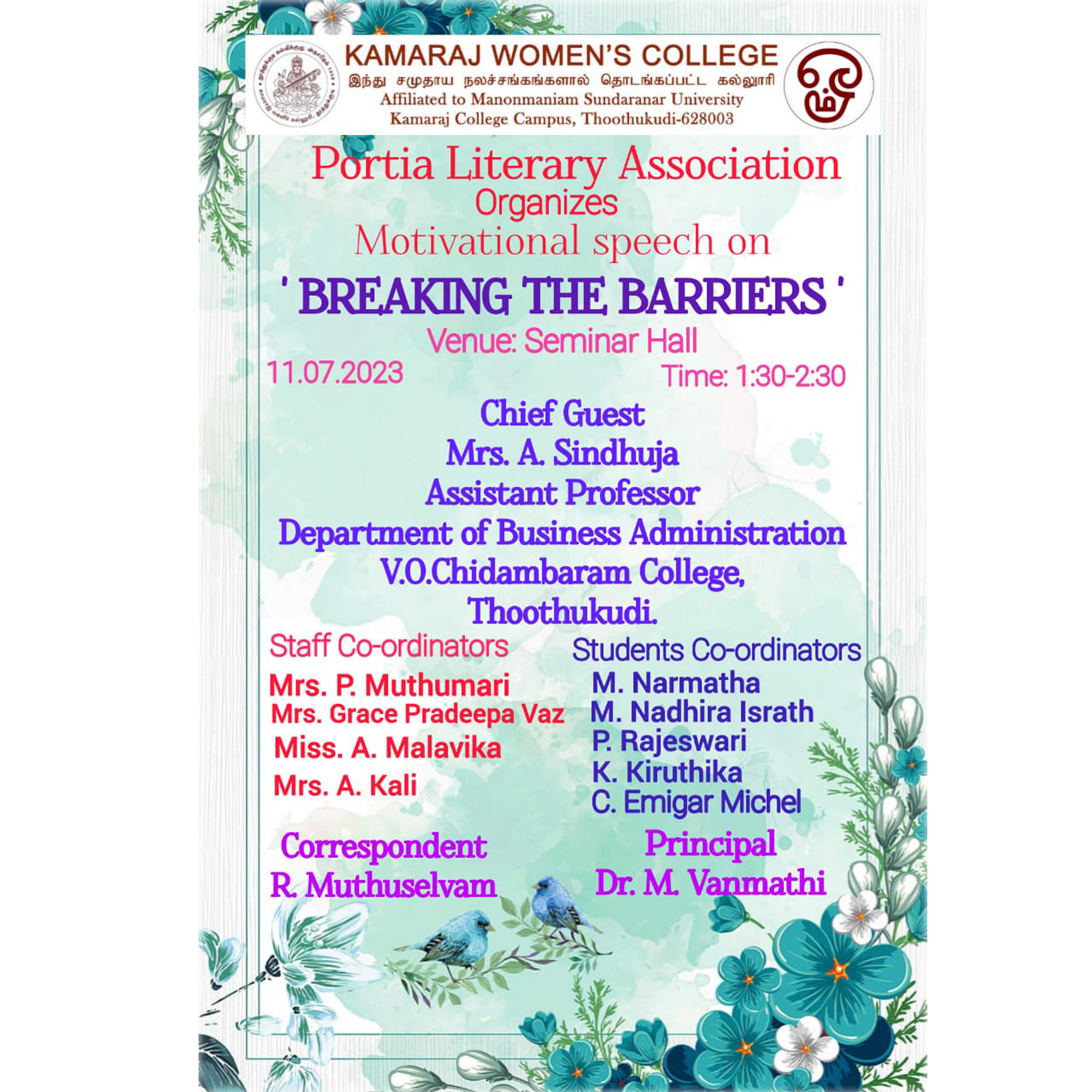 Portia literary association has organised Motivational speech on ‘Breaking the Barriers’ on 11/07/2023 . The program started with the prayer song followed by welcome speech given by C. Emigar Michel . Our Principal Dr. M. Vanmathi gave a presidential address. Mrs. A. Sinthuja ,Assistant Professor, Department of Business Administration, V.O.Chidambaram College , was the resource person and gave a wonderful speech on barriers faced by teenage students and how to face the barriers. All the first year students were benefited by the program. The programme came to an end with the national anthem.