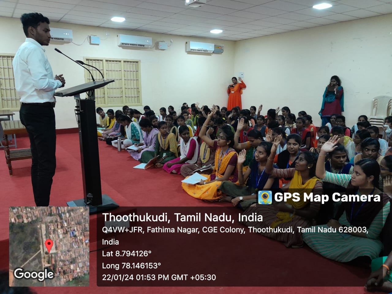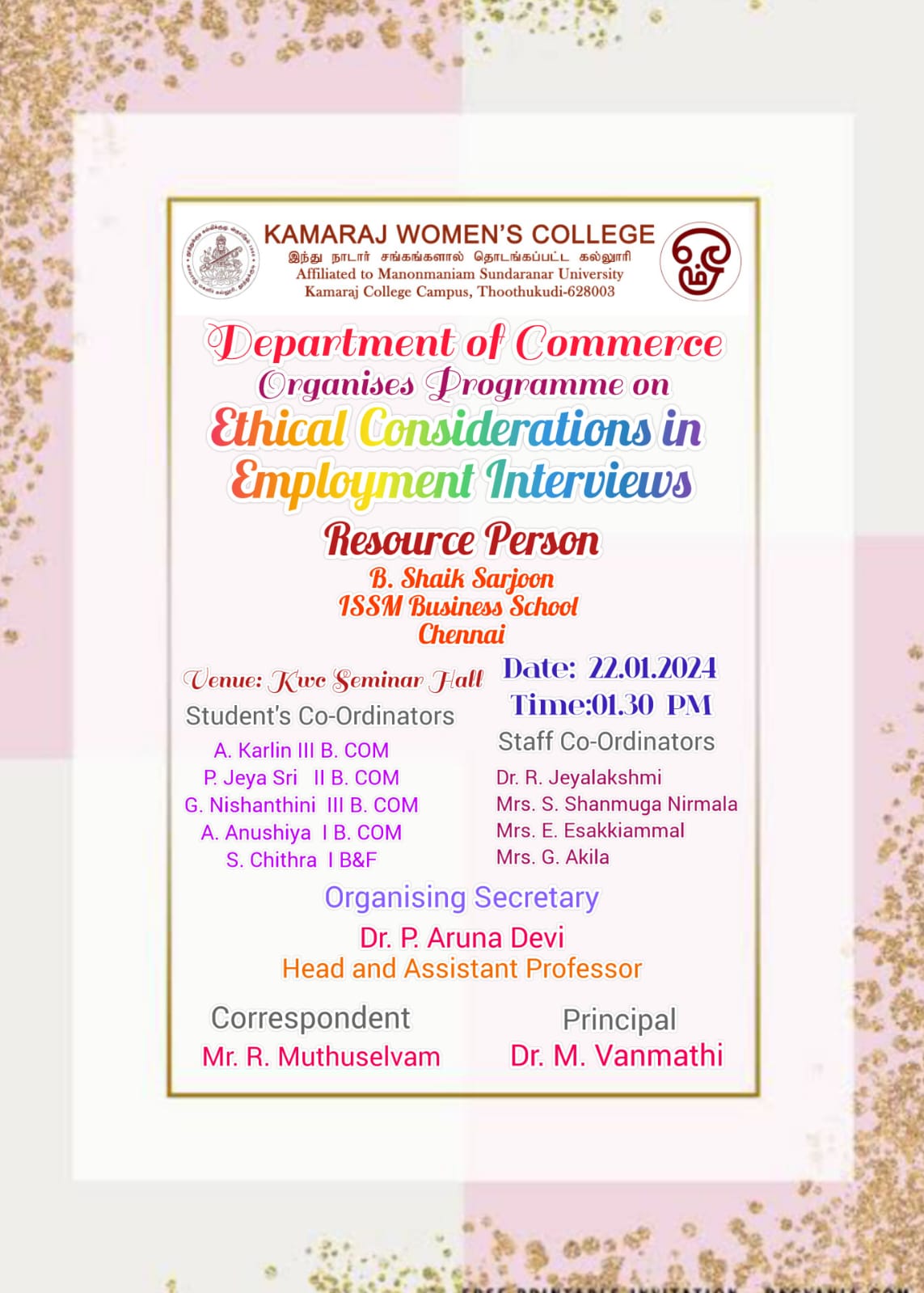 Kamaraj Women’s College, Department of Commerce, organized the Program Ethical Considerations in Employment Interviews on 22 January 2024. The resource person was B.Shaik Sarjoon, ISSM Business School, Chennai. The speaker emphasized the importance of fairness, confidentiality, and transparency. They discussed the need to avoid biased questioning, respect candidates’ privacy, and adhere to anti-discrimination laws. Practical insights were shared on crafting job-related questions, maintaining a respectful demeanour, and fostering a positive candidate experience. Overall, the lecture emphasized ethical guidelines to ensure a just and equitable employment interview process. 150 students participated in the guest lecture program.