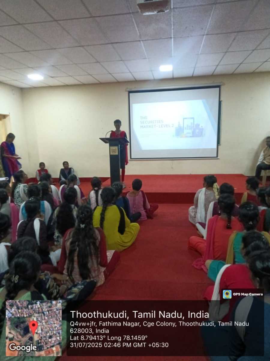 The Department of Commerce and Banking & Finance of Kamaraj Women’s College hosted a valuable guest lecture program titled “Securities Market and Career Opportunities” on 31st July 2025. Securities Market Career Session was designed to educate students about the functioning of capital markets and the many career paths available within the finance industry.