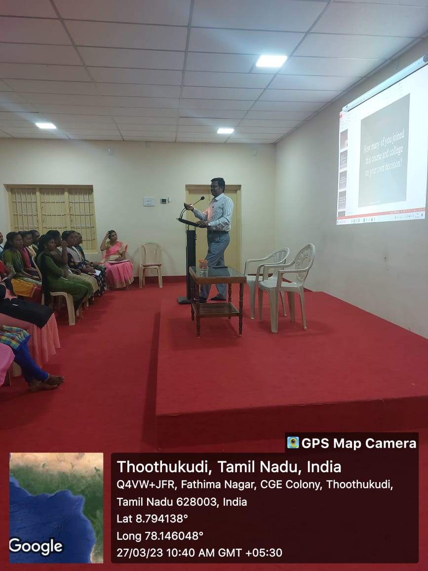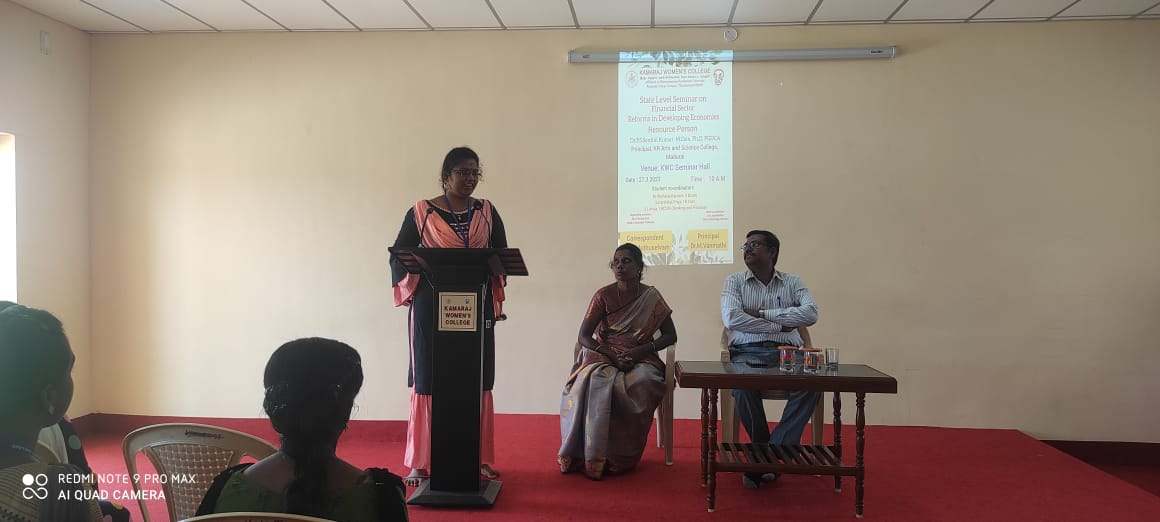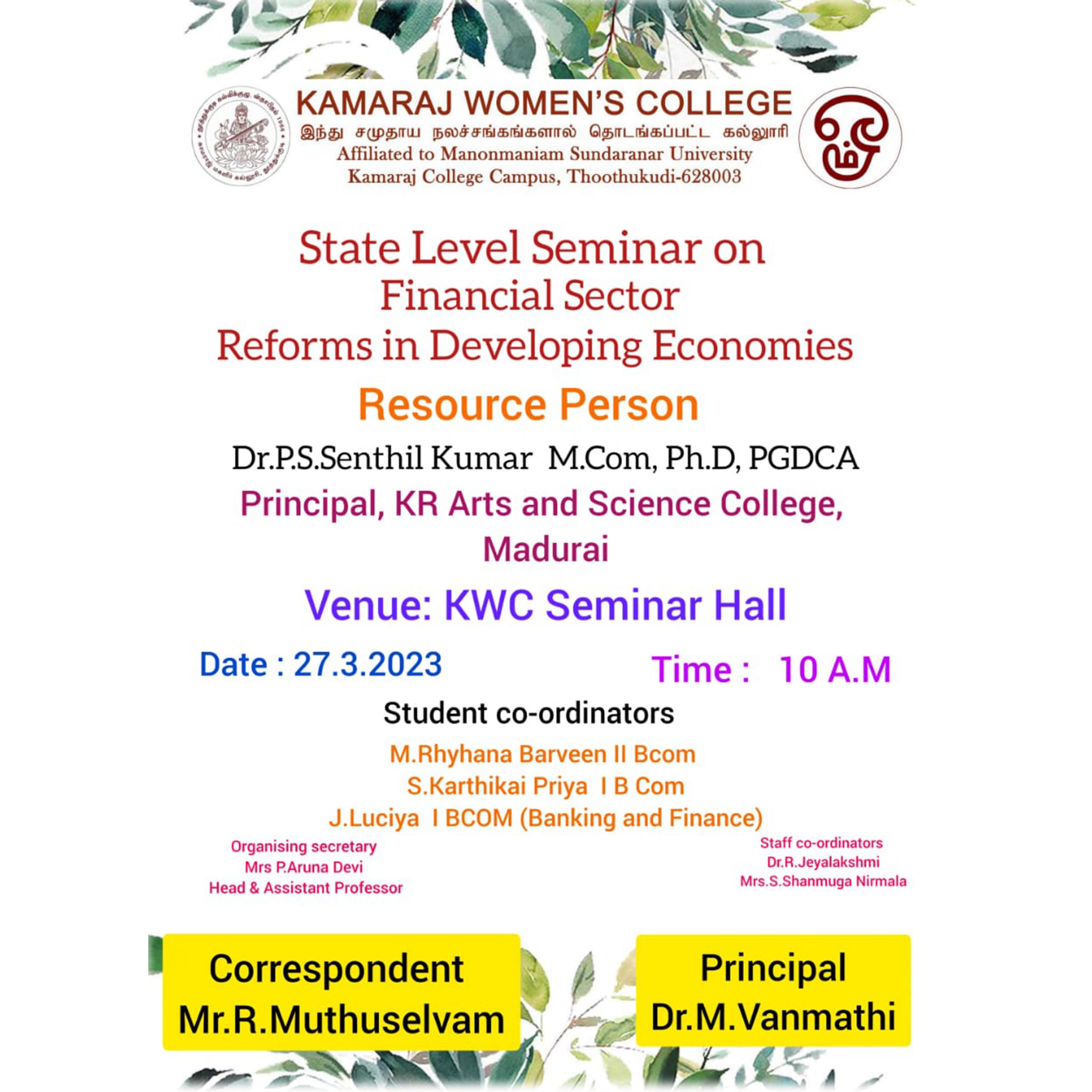 Kamaraj Women’s College Department of Commerce organised a State-Level Seminar on the topic of Financial Sector Reforms in Developing Economies on March 27, 2023. The resource person’s name is Dr. P.S.Senthil Kumar from Madurai. Students understood what financial sectors are, how they are being reformed by the public and government, and how these reforms help a country’s economic growth. Student coordinators Rhyhana Barveen (II BCOM), Luciya (I BCOM Banking and Finance), and Karthigai Priya (I BCOM) arranged the seminar. Eighty students participated in the state-level seminar.